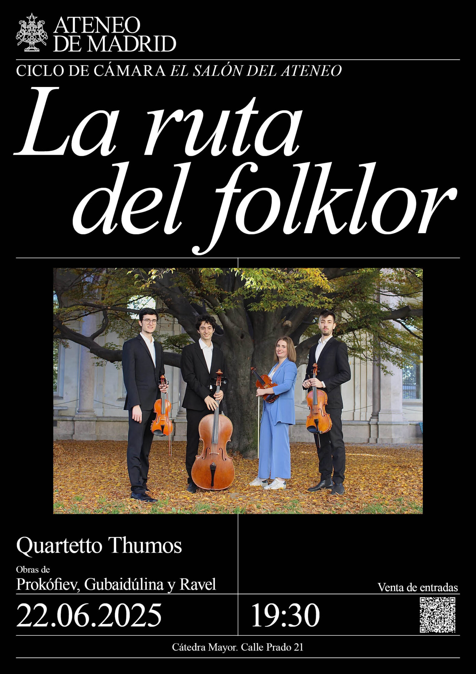 Ciclo de cámara El Salón del Ateneo. Obras de Mozart, Ligeti y Taffanel. Como cierre de temporada 24-25 del ciclo de cámara El Salón del Ateneo, el cuarteto de cuerdas con sede en Alemania Quartetto Thumos visitará el coliseo madrileño con su programa ‘La ruta del folklor’.