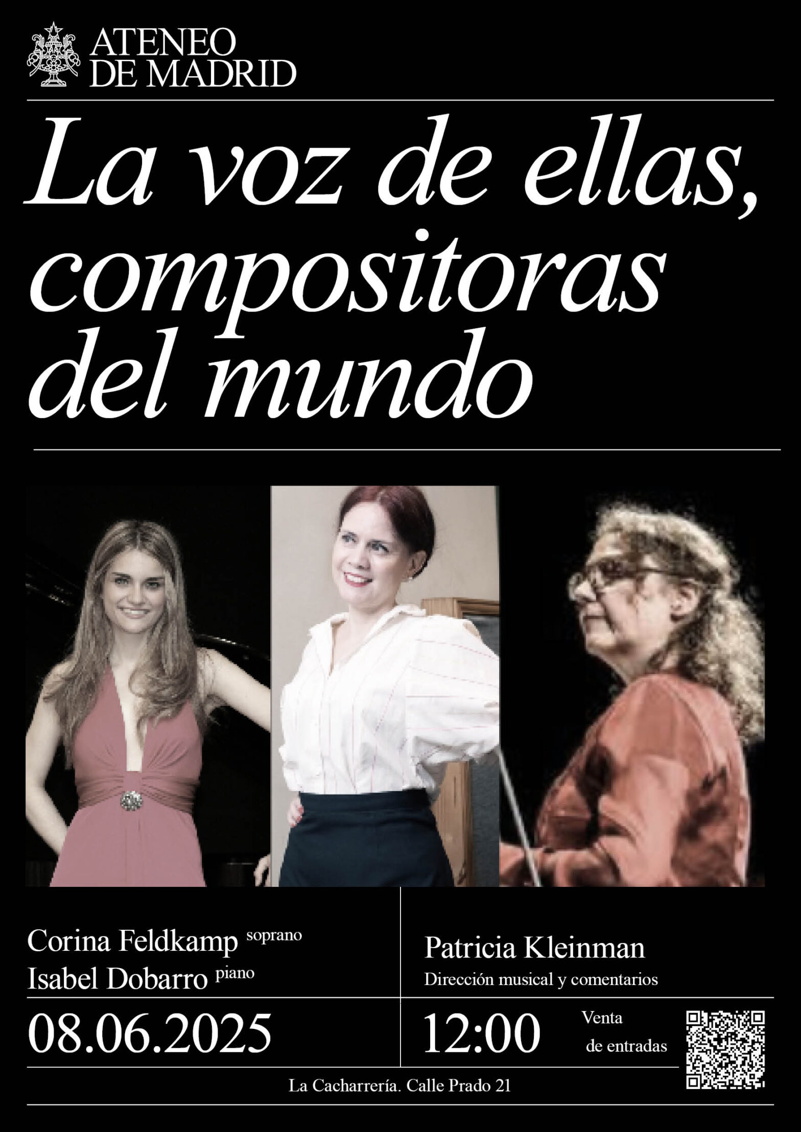 Con un programa curado por Patricia Kleinman, en el marco de su labor de investigación y difusión a través de Proyecto Compositoras, La voz de ellas: compositoras del mundo supone un viaje sonoro por obras escritas a manos de mujeres desde el año 1785 a la actualidad.