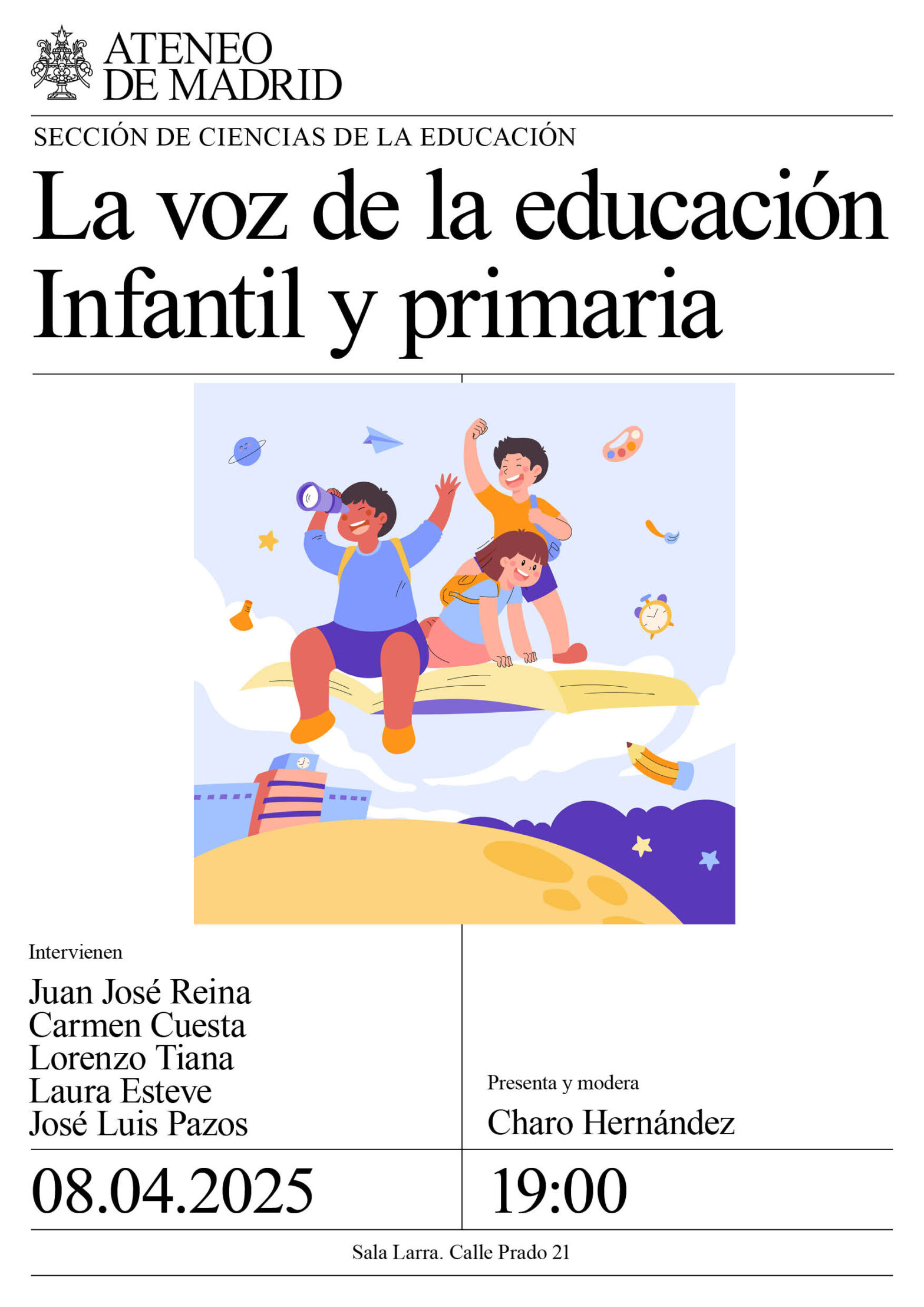 Sección de Ciencias de la Educación. Intervienen: Juan José Reina, inspector de Educación y licenciado en Pedagogía; Carmen Cuesta, directora de Casas de Niños y Escuelas Infantiles en la Comunidad de Madrid y asesora de Educación en el Ayuntamiento de Getafe; Lorenzo Tiana, maestro en Escuelas Infantiles y Centros de Educación Infantil y miembro del MRP Acción Educativa; Laura Esteve, maestra de Infantil, licenciada en Pedagogía y miembro del MRP Escuela Abierta; José Luis Pazos, FAPA Giner de los Ríos. Presenta y modera Charo Hernández. Sala Larra. 19:00h.