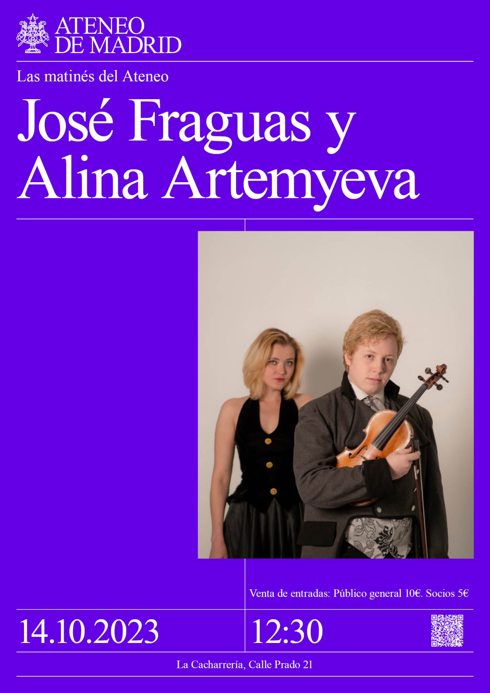 El violinista José Fraguas (25 años) es ganador de más de 15 premios internacionales, premiado por el INAEM, doble máster en interpretación y pedagogía musical, premio extraordinario en el conservatorio Padre Antonio Soler, «Violinista del Año» en las jornadas musicales Du Choletais (Francia). Fraguas es asiduo del Ateneo desde su debut en esta casa con las estaciones de Vivaldi y los Virtuosos de Madrid a los 11 años. Desde entonces, ha ofrecido en el Ateneo, más de 50 recitales a lo largo de su joven carrera. José será la figura principal en una serie de conciertos excepcionales en los que podrán escuchar el sonido de su violín Jean Baptiste Vuillaume cedido por la Fundación Amour des Vies. José Fraguas contará en la mayoría de matinés con la presencia de Alina Artemyeva, pianista Ucraniana con numerosos premios internacionales, y pianista oficial de la Escuela Superior de Música Reina Sofía. Una oportunidad única para vivir la música clásica en su máxima expresión, como se concibió para ser escuchada en su origen, de cerca.