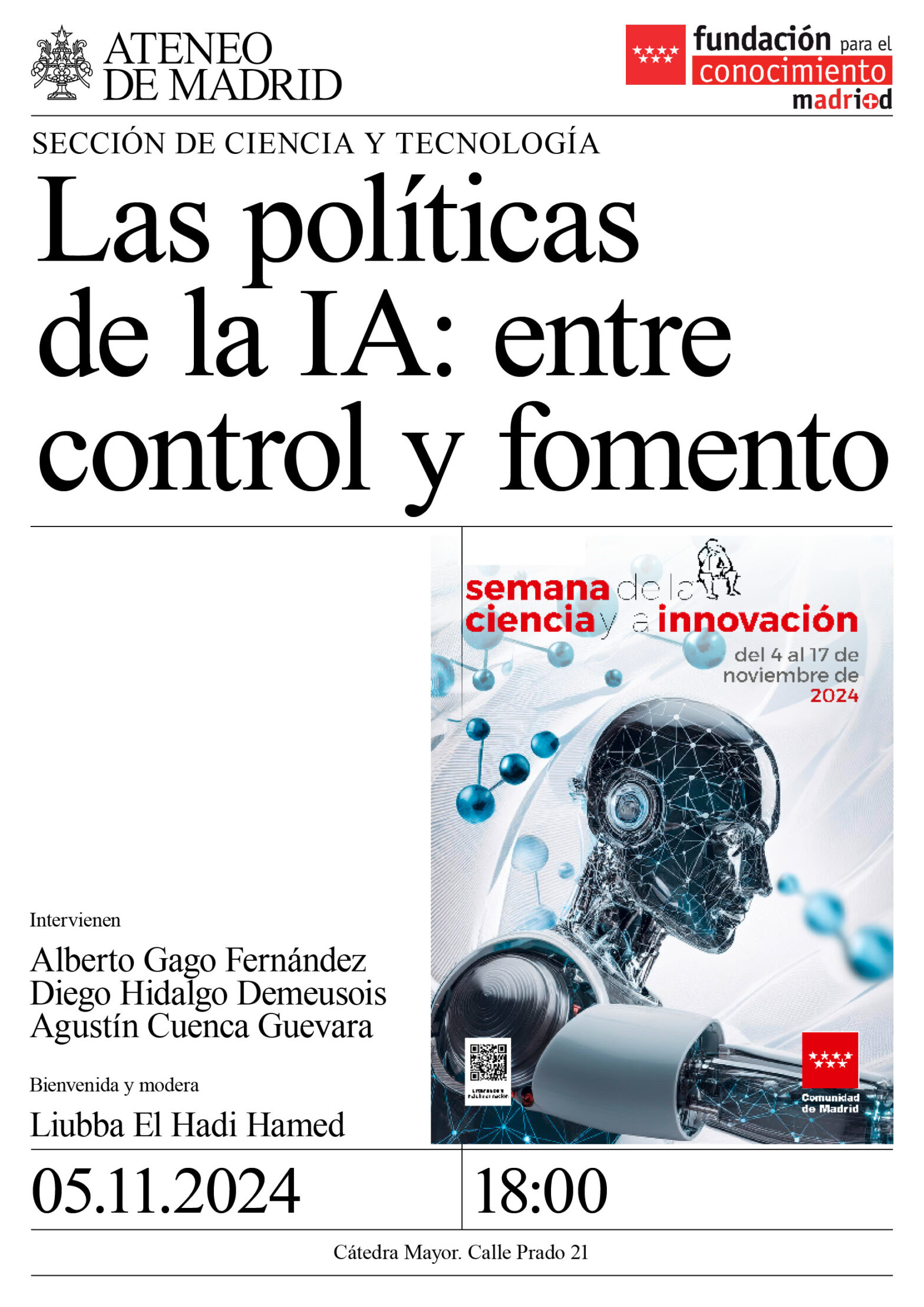 Sección de Ciencia y Tecnología. Intervienen: Alberto Gago Fernández, asesor del Gabinete de la Secretaría de Estado de Digitalización e Inteligencia Artificial; Diego Hidalgo Demeusois, autor de Retomar el control; y Agustín Cuenca Guevara, fundador de Entaina. Bienvenida y modera: Liubba El Hadi Hamed. Cátedra Mayor. 18:00h.