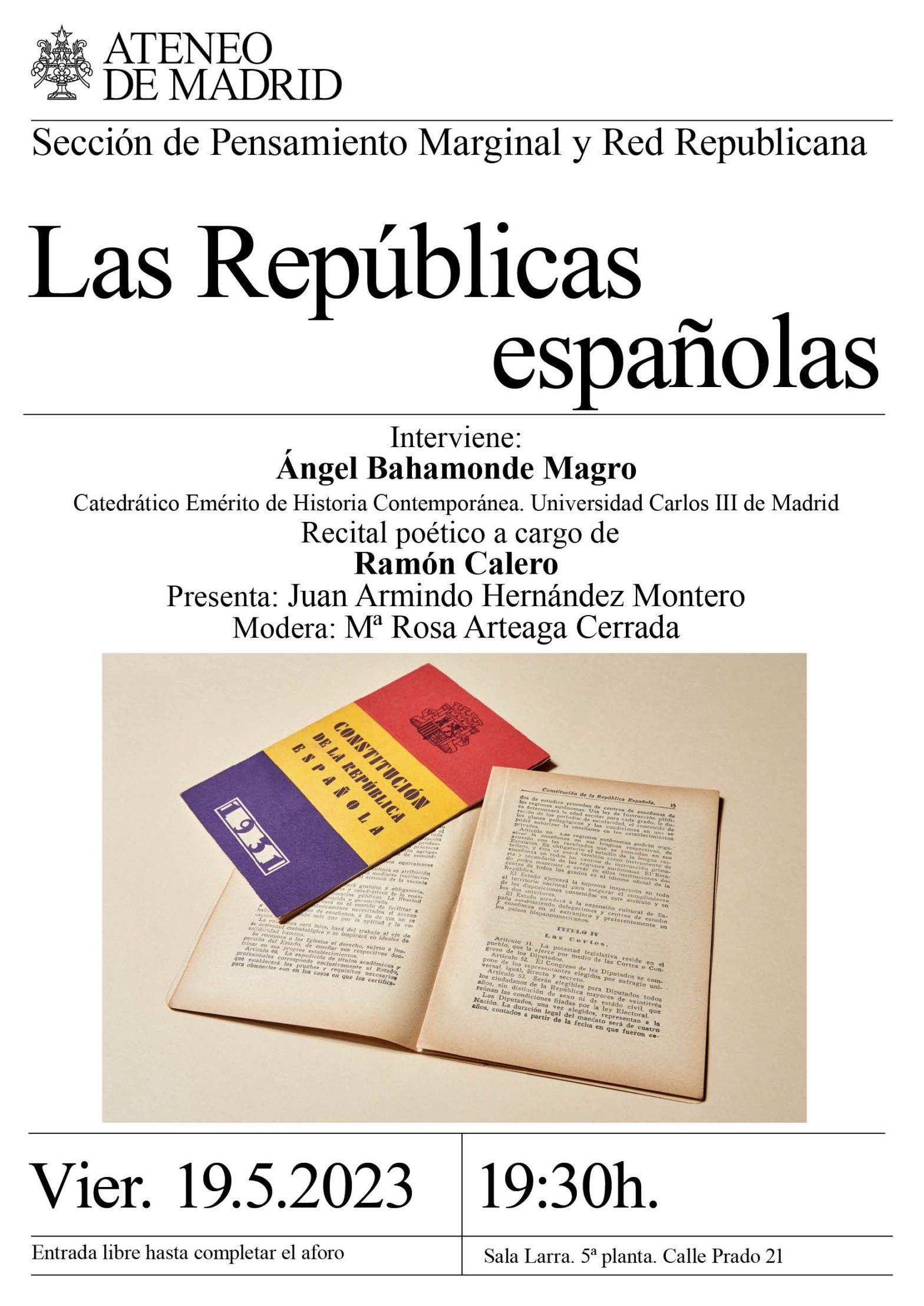 Sección de Pensamiento Marginal y Red Republicana. Ponente: Ángel Bahamonde Magro, catedrático Emérito de Historia Contemporánea. Universidad Carlos III de Madrid . Recital poético a cargo de Ramón Calero. Presenta: Juan Armindo Hernández Montero. Modera: Mª Rosa Arteaga Cerrada. Sala Larra. 19:30h.