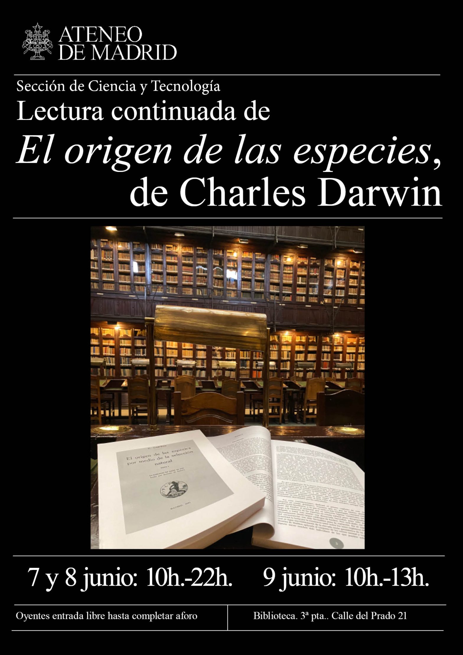 En el Ateneo de Madrid celebramos el diálogo entre ciencia y literatura con la lectura continuada de El origen de las especies por medio de la selección natural, de Charles Darwin, publicada por primera vez el 24 de noviembre de 1859 y traducida al castellano por Antonio de Zulueta en 1921.