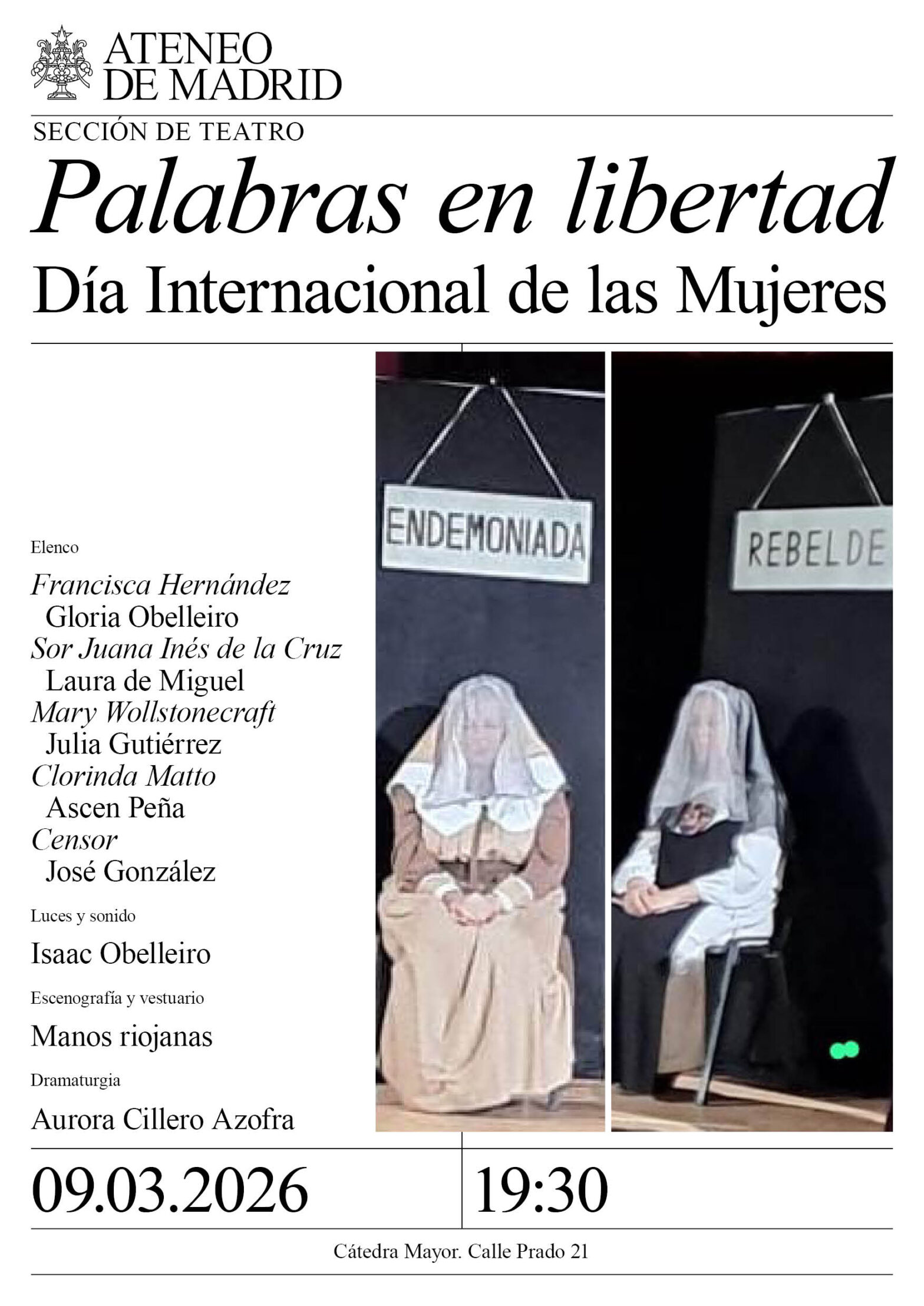 Sección de Teatro. Elenco: Francisca Hernández – Gloria Obelleiro; Sor Juana Inés de la Cruz – Laura de Miguel; Mary Wollstonecraft – Julia Gutiérrez; Clorinda Matto – Ascen Peña; y Censor: José González. Luces y sonido: Isaac Obelleiro. Escenografía y vestuario: Manos riojanas. Dramaturgia: Aurora Cillero Azofra. Cátedra Mayor. 19:30h.