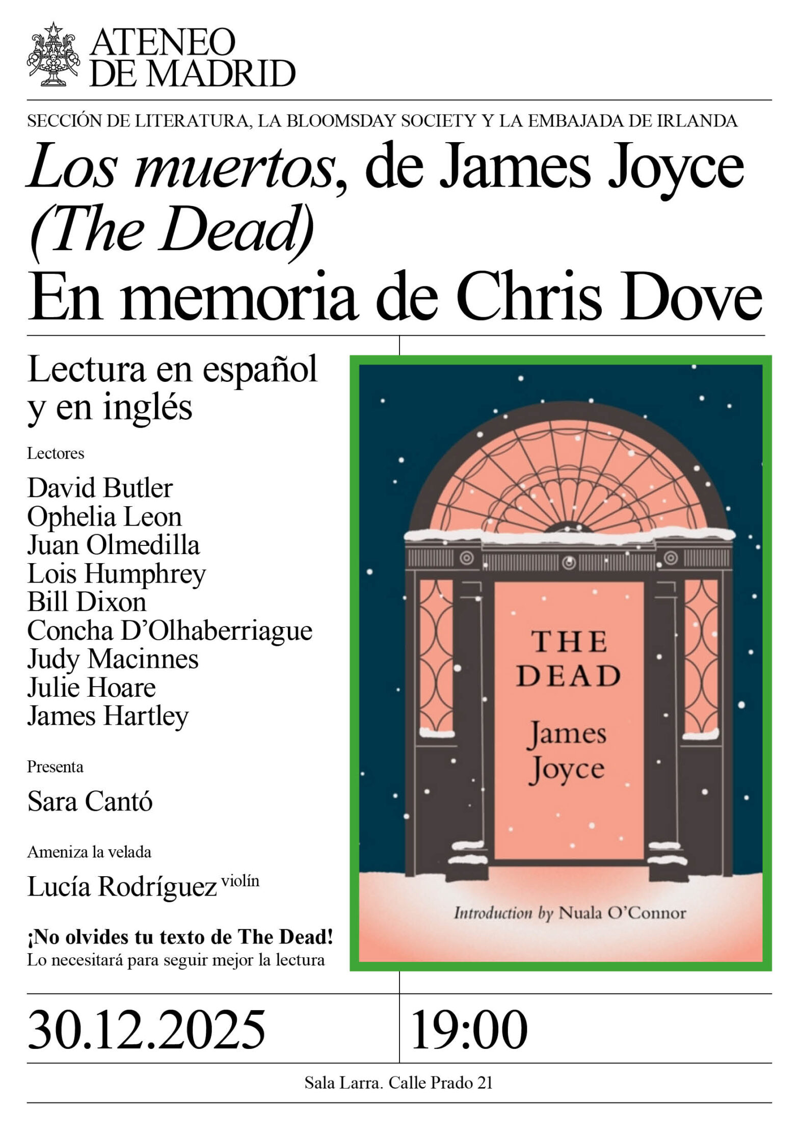 Bloomsday Society y la Embajada de Irlanda Lectores: David Butler, Ophelia Leon, Juan Olmedilla , Lois Humphrey, Bill Dixon, Concha D’Olhaberriague, Judy Macinnes, Julie Hoare y James Hartley. Presenta: Sara Cantó. Ameniza la velada: Lucía Rodríguez, violín. ¡No olvides tu texto de The Dead! Lo necesitará para seguir mejor la lectura. Sala Larra. 19:00h.