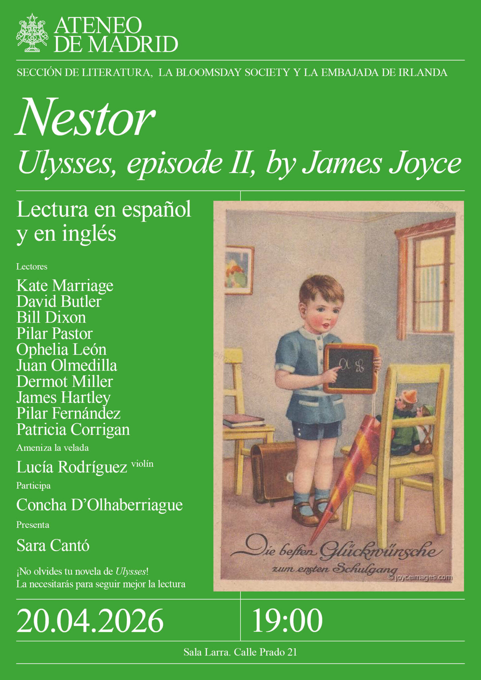 Sección de Literatura, la Bloomsday Society y la Embajada de Irlanda. Lectores: Kate Marriage, David Butler, Bill Dixon, Pilar Pastor, Ophelia Leon, Juan Olmedilla, Dermot Miller, James Hartley, Pilar Fernández y Patricia Corrigan. Ameniza la velada: Lucía Rodríguez, violín. Participa: Concha ‘Olhaberriague. Presenta: Sara Cantó. Sala Larra. 19:00h. ¡No olvides tu novela de Ulysses! La necesitarás para seguir mejor la lectura.