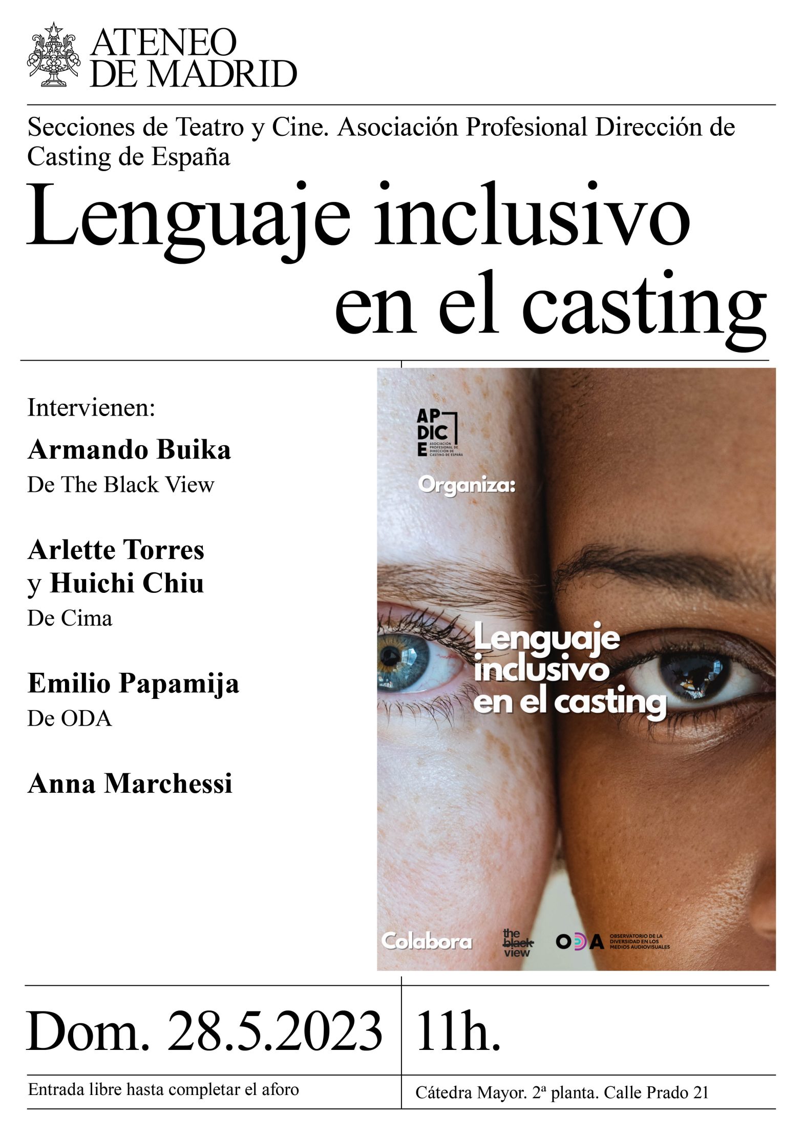 Secciones de Teatro y Cine. Asociación Profesional Dirección de Casting de España. Intervienen: Armando Buika, de The Black View; Arlette Torres y Huichi Chiu, de Cima; Emilio Papamija, de ODA; Anna Marchessi. Cátedra Mayor. 11h.