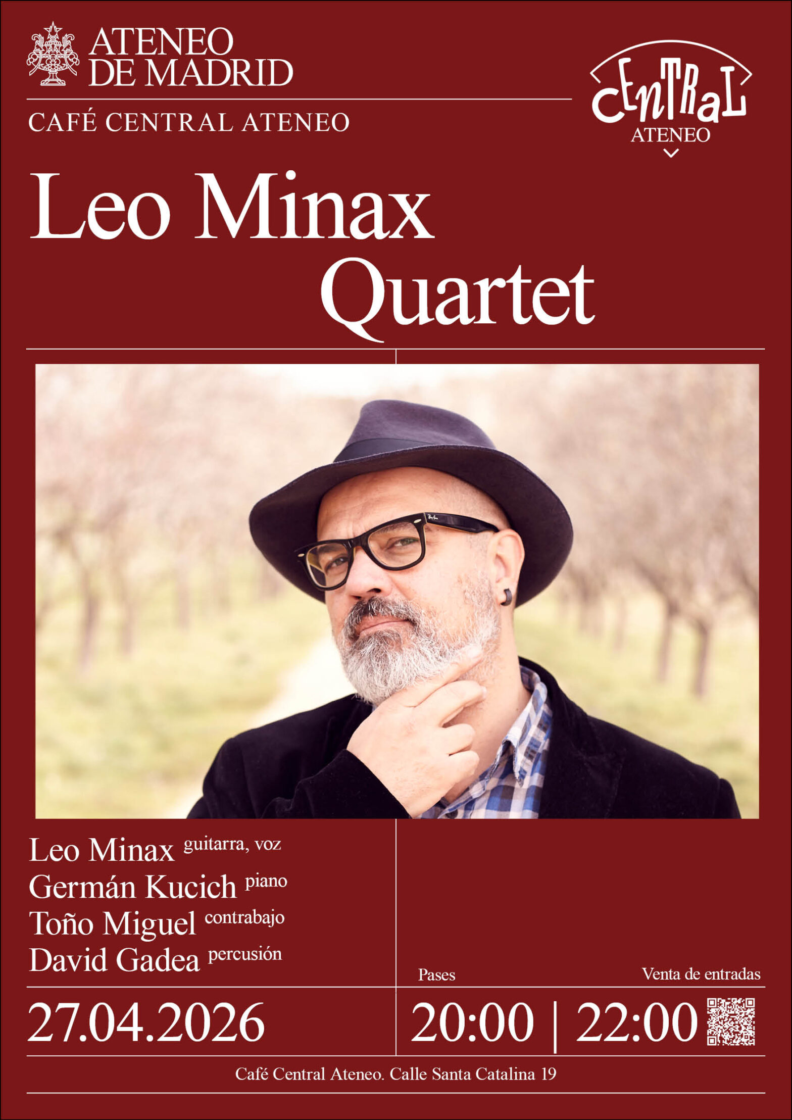 Café Central Ateneo. Leo Minax, guitarra, voz; Germán Kucich, piano; Toño Miguel, contrabajo; y David Gadea, percusión. Santa Catalina, 19. Pases: 20:00h. y 22:00h.