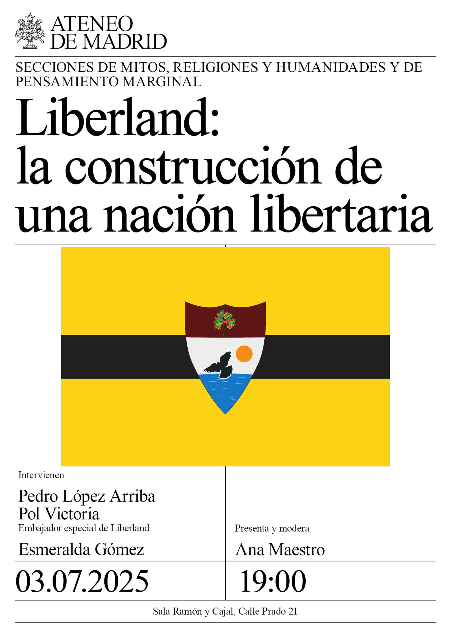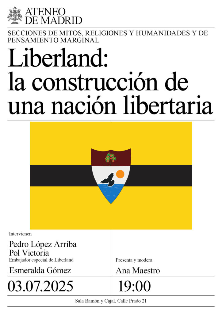 Secciones de Mitos, Religiones y Humanidades y de Pensamiento Marginal. Intervienen: Pedro López Arriba, Pol Victoria, embajador especial de Liberland y Esmeralda Gómez. Presenta y modera: Ana Maestro. Sala Ramón y Cajal. 19:00h.