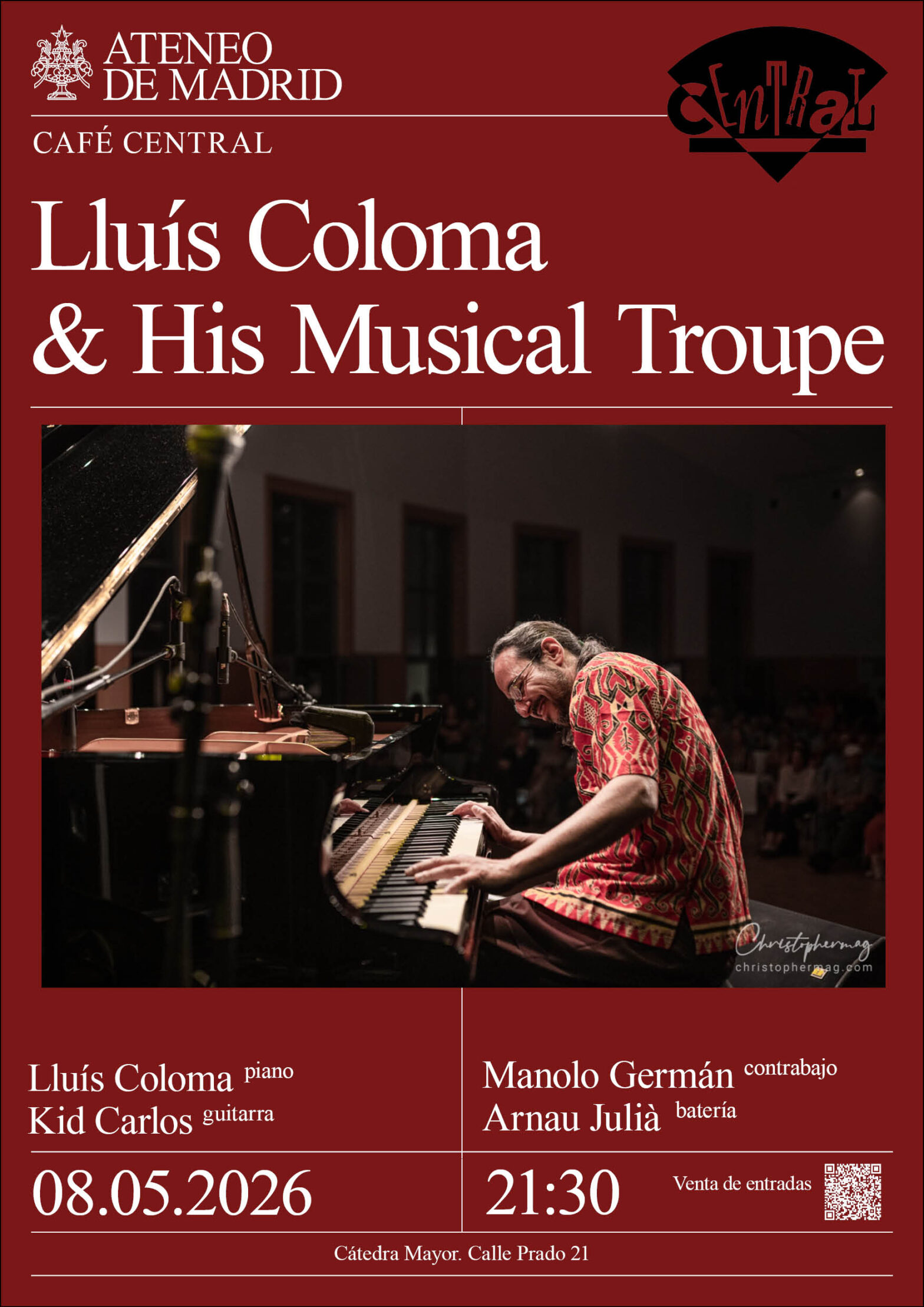 Ateneo – Café Central. Lluís Coloma, piano; Kid Carlos, guitarra; Manolo Germán, contrabajo; y Arnau Julià, batería. 25 años de música – Blues & Boogie Woogie & Jazz and more. Cátedra Mayor. 21:30h.