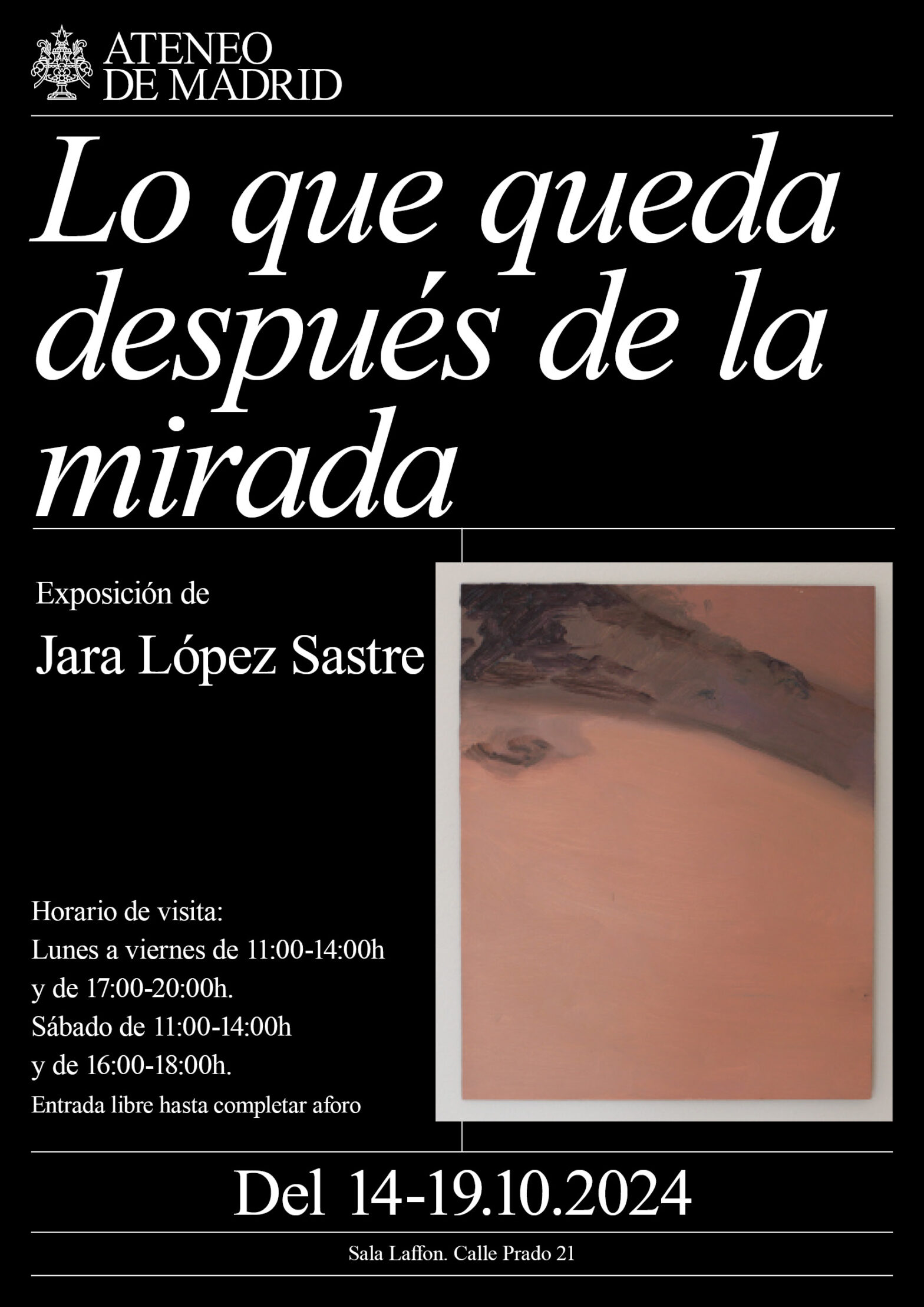 Tras exponer en galerías internacionales como Palo Gallery y en Times Square x Lux Femina, y trabajar en el Museo del Prado, Chillida Leku, ARCO o la galería Fahrenheit, entre otros, Jara López Sastre se estrena en el Ateneo de Madrid con su primera exposición en solitario en España. La exposición Lo que Queda Después de la Mirada, que tendrá lugar en la sala Laffón del 14 al 19 de octubre en horario de 11.00 a 14.00h. y de 17.00 a 20.00h., invita al espectador a reflexionar sobre la relación de un cuerpo frente a otro, a cuestionar si un cuerpo puede reclamar su plena capacidad al ser desconocido al ojo ajeno, así como a recalibrar nuestra relación frente a un cuerpo conocido, uno desconocido y lo que entendemos por esto. La exposición estará comisariada por Andrea Torriglia de Altolaguirre, socia y directora de la galería neoyorquina Gratin, reconocida mundialmente por su radicalidad a la hora de elegir a sus artistas y exposiciones.