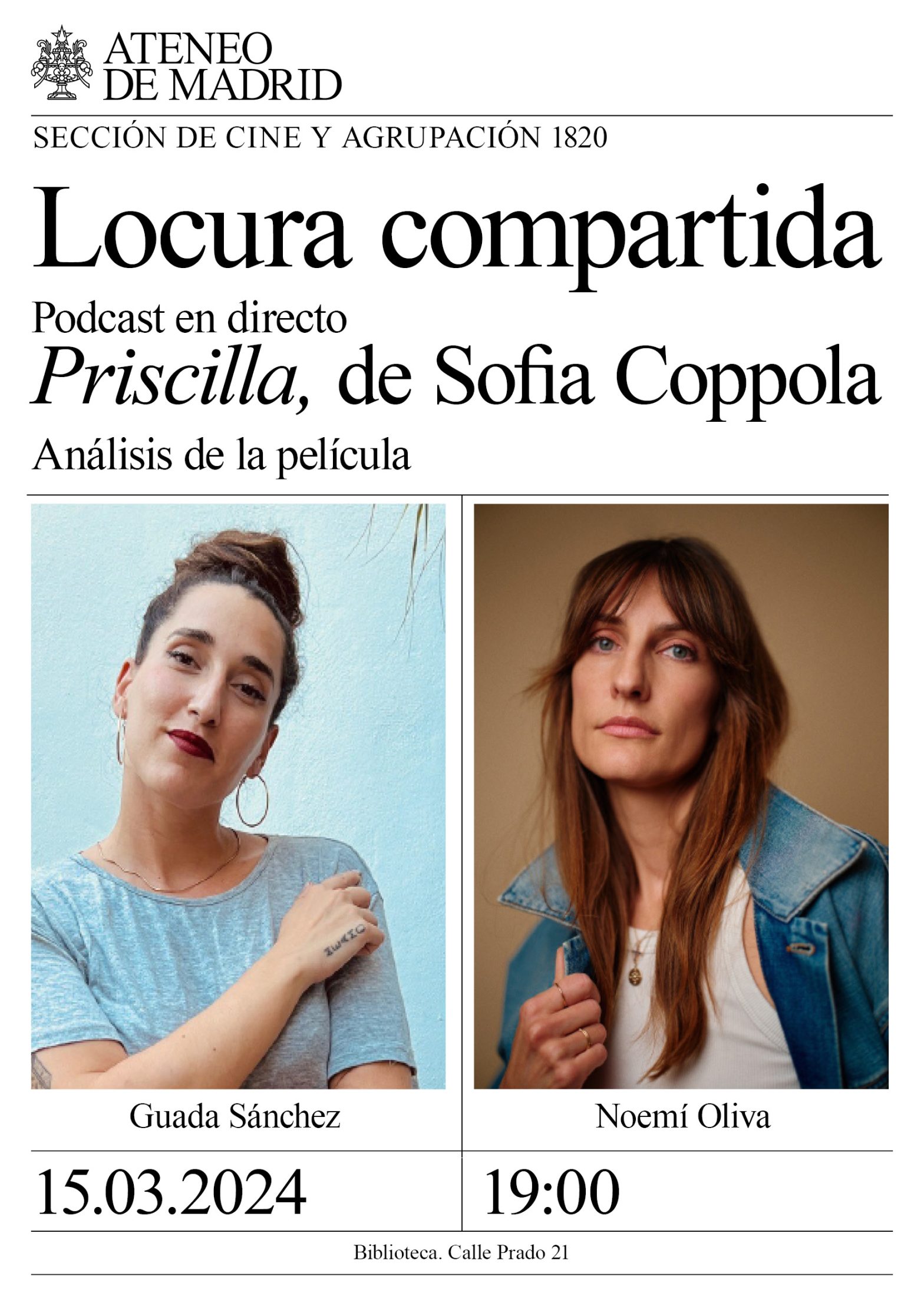 Sección de Cine y Agrupación 1820. Intervienen: Noemí Oliva, licenciada en Psicología, máster en Gestión Cultural, responsable del programa de arte y exposiciones en el Club Matador en Madrid y realiza el podcast de cultura y psicología Locura compartida. Guada Sánchez, licenciada en Psicología y máster en Psicología Positiva Aplicada y en Psicología Sanitaria y dirige el canal de divulgación de psicología y salud mental para mujeres @eyaspsiscolgía. Biblioteca. 19:00h.