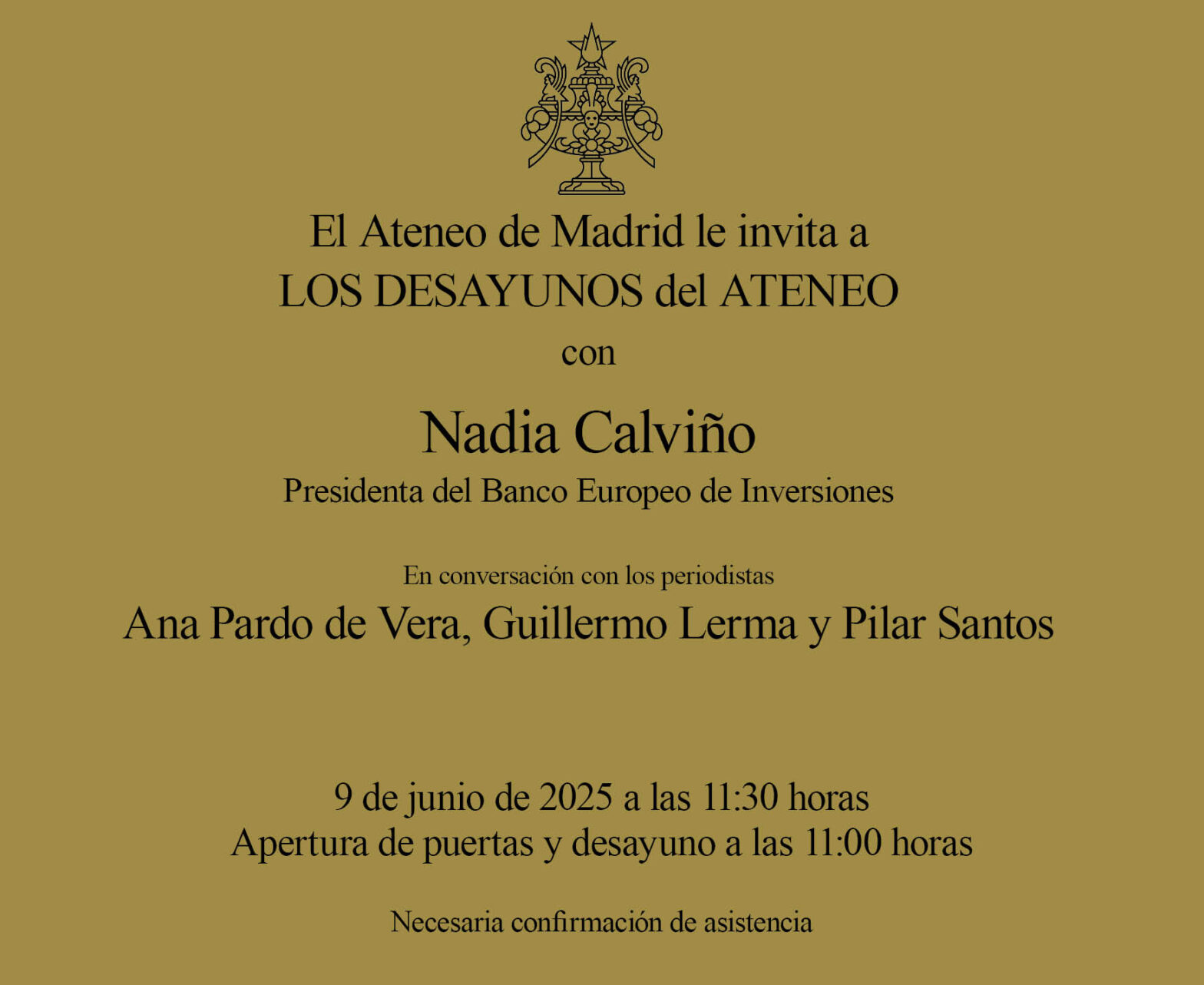 Con Nadia Calviño, presidenta del Banco Europeo de Inversiones. En conversación con los periodistas Ana Pardo de Vera, Guillermo Lerma y Pilar Santos. Cátedra Mayor. 11:00h.