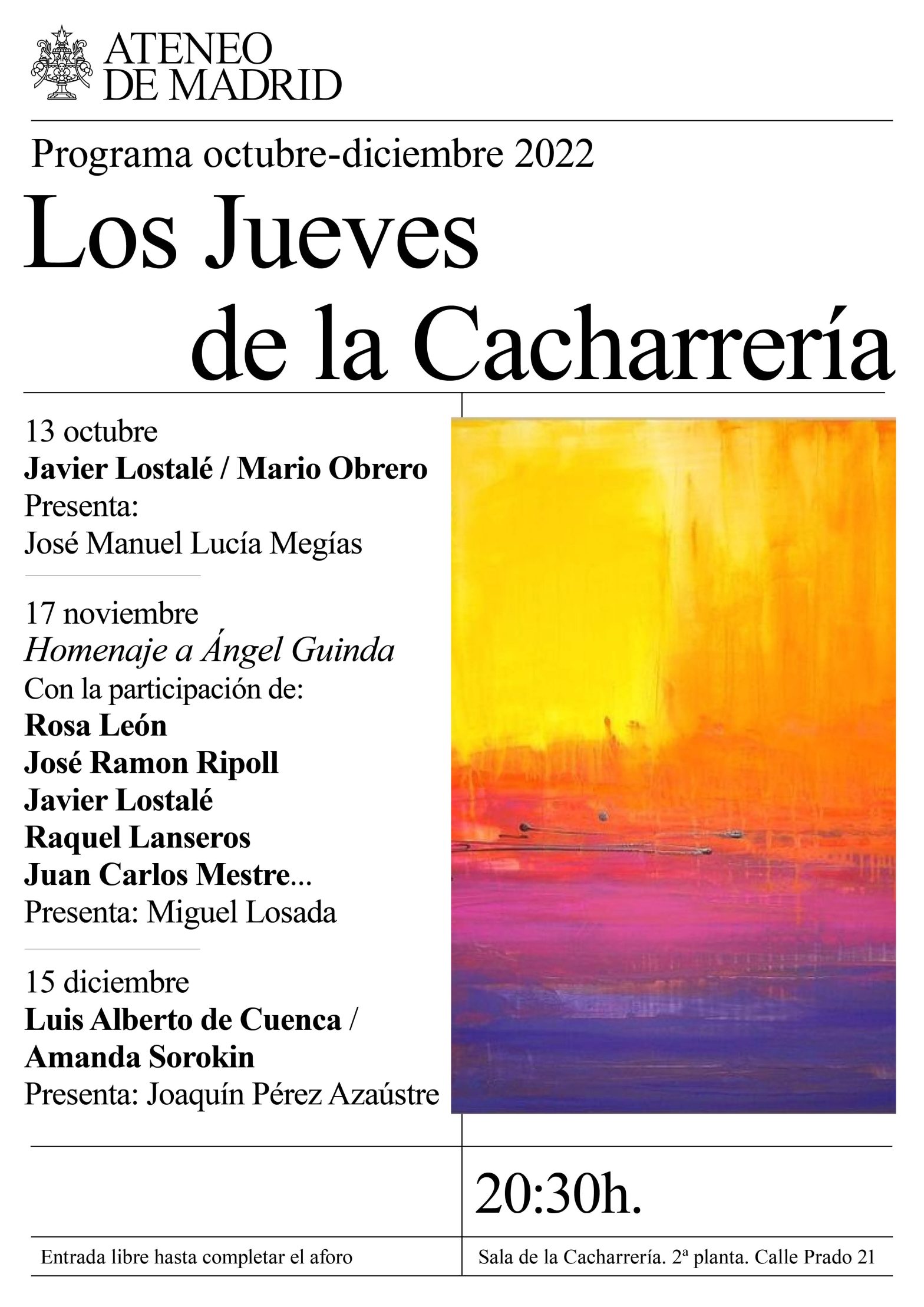 Los Jueves de la Cacharrería vienen a recuperar una tradición con solera: la de las veladas poéticas que se celebraban los viernes por la tarde como estación de paso para los poetas residentes y de visita en Madrid. Reconvertidos en esta nueva etapa en Los Jueves de la Cacharrería, se estructurarán en torno a lecturas poéticas por parejas, buscando el diálogo entre distintas generaciones, procedencias y escuelas poéticas.