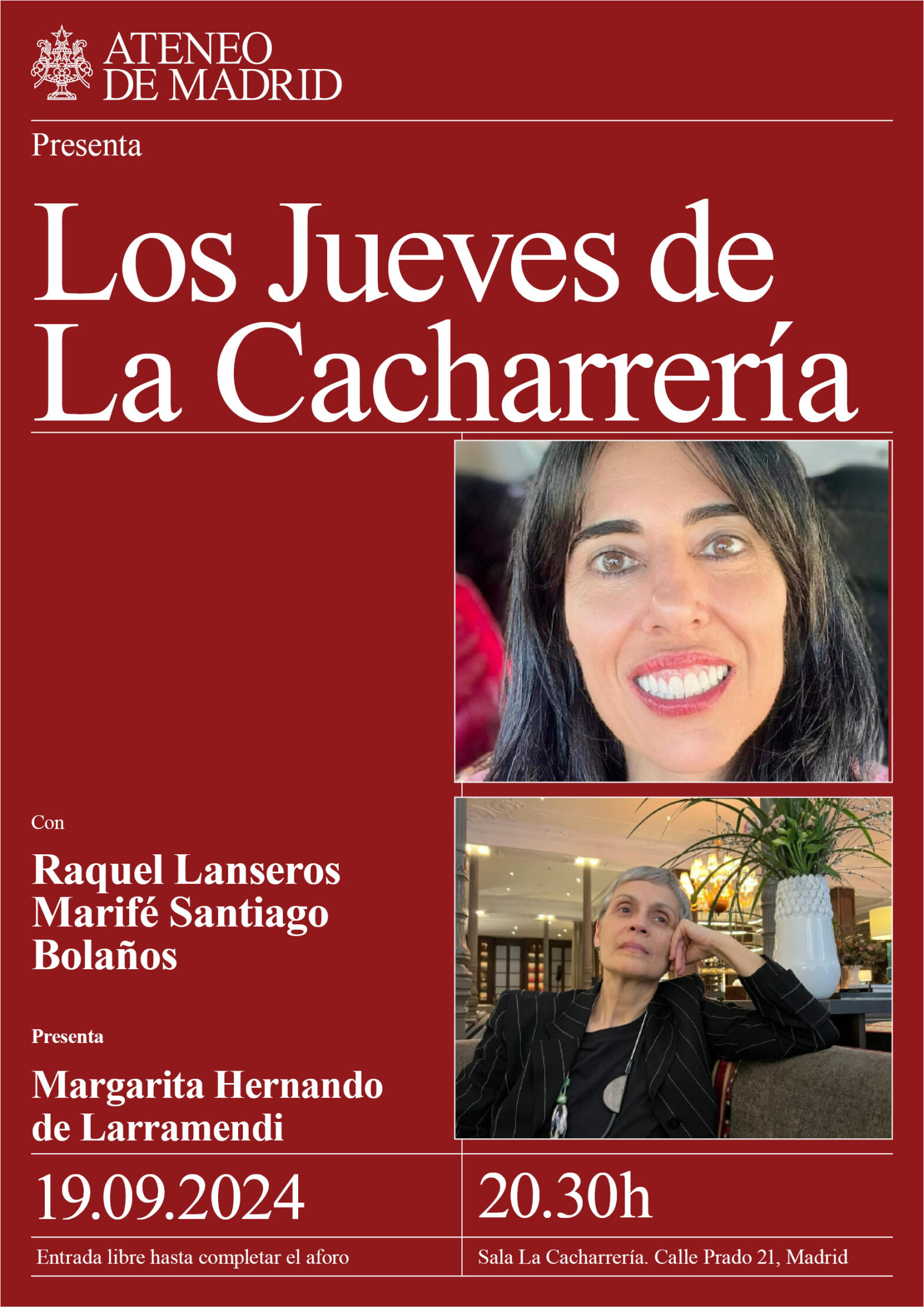 Con: Raquel Lanseros y Marifé Santiago Bolaños. Presenta: Margarita Hernando de Larramendi. Sala La Cacharrería. 20:30h.