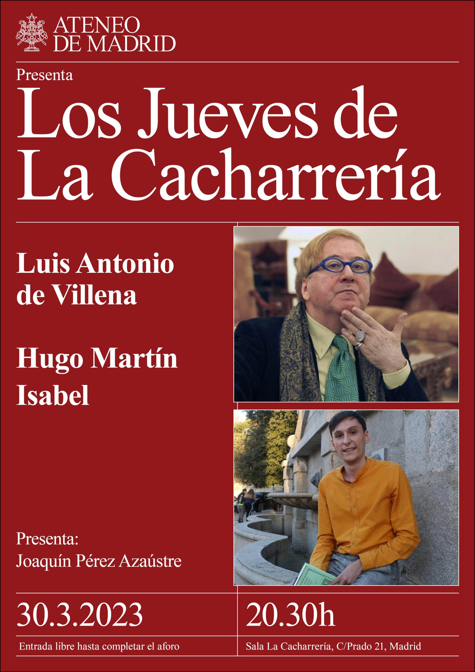 Los Jueves de la Cacharrería. Luis Antonio de Villena y Hugo Martín Isabel. Presenta: Joaquín Pérez Azaústre. Sala la Cacharrería. 20:30h.