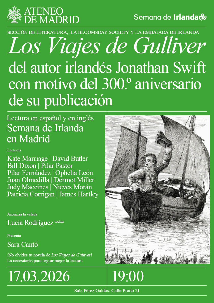 Lectura en español y en inglés. Los joyceanos del Ateneo de Madrid celebran la Semana de Irlanda en Madrid, festividad de San Patricio. Lectores: Kate Marriage, David Butler, Bill Dixon, Pilar Pastor, Pilar Fernández, Ophelia Leon, Juan Olmedilla, Dermot Miller, Judy Maccines, Nieves Morán, Patricia Carrigan y James Hartley. Ameniza la velada: Lucía Rodríguez, violín. Presenta: Sara Cantó. Sala Pérez Galdós. 19:00h. Semana de Irlanda 2026: www.semanadeirlanda.es