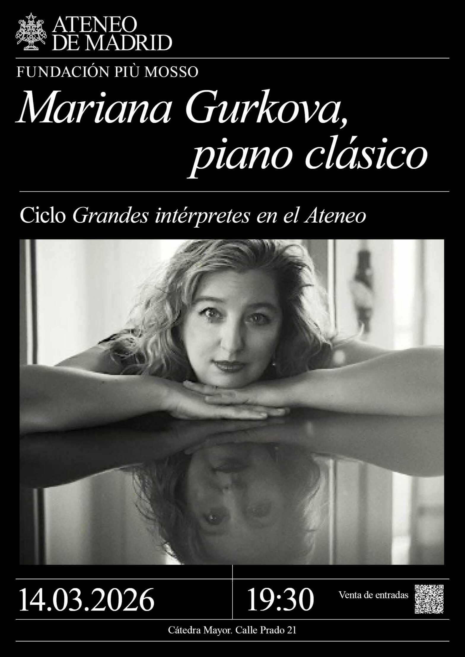 Fundación Più Mosso. Ciclo Grandes intérpretes del Ateneo. Curriculum y programa (ver). La extraordinaria pianista catedrática de piano del RCSMM. Cátedra Mayor. 19:30h.