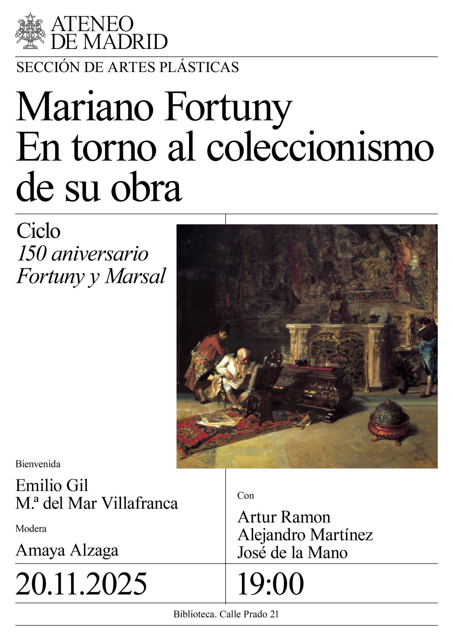 Sección de Artes Plásticas. Bienvenida: Emilio Gil y M.ª del Mar Villafranca. Con: Artur Ramon, Alejandro Martínez y José de la Mano. Modera: Amaya Alzaga. Biblioteca. 19:00h.
