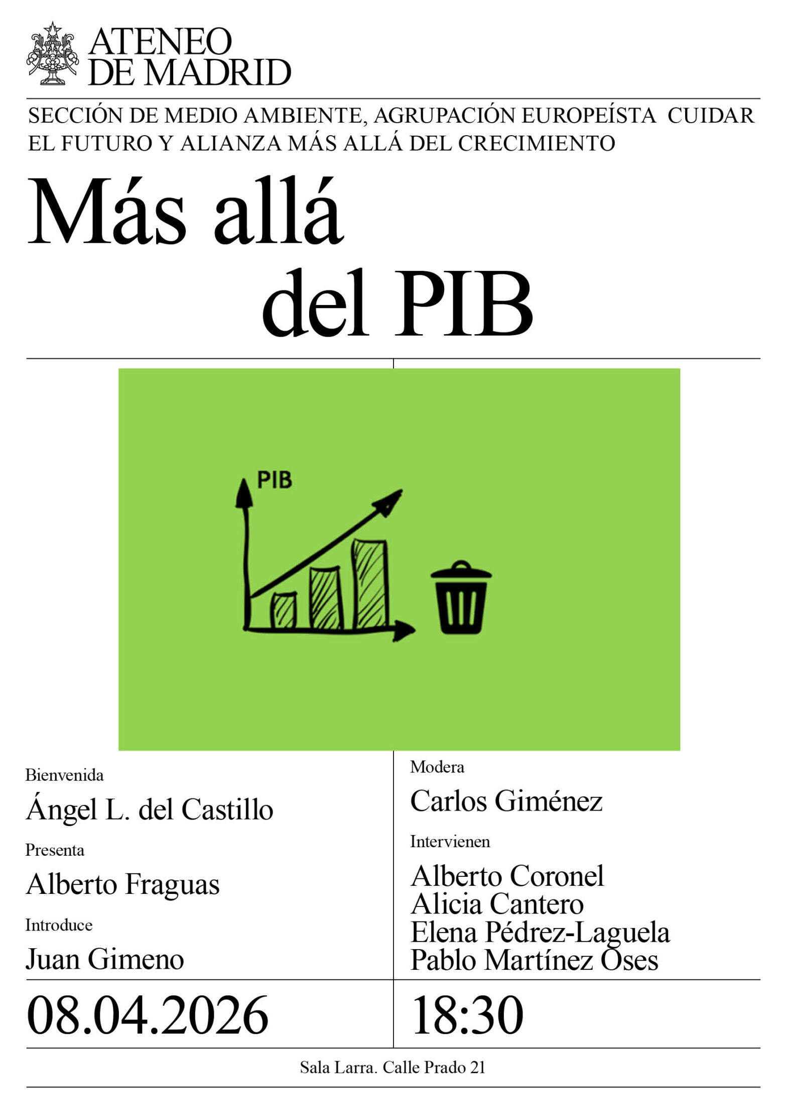 Sección de Medio Ambiente, Agrupación Europeísta cuidar el futuro y Alianza Más allá del Crecimiento. Bienvenida: Ángel L. del Castillo. Presenta: Alberto Fraguas, Alianza más allá del crecimiento. ATTAC. Introduce: Juan Gimeno, Plataforma por la Justicia Fiscal. Modera: Carlos Giménez, Instituto Demospaz. UAM. Intervienen: Alberto Coronel, Rebelión Científica; Alicia Cantero, Paz Verde; Elena Pédrez-Laguela, Observatorio UCM 2030; y Pablo Martínez Oses, Economistas sin fronteras. Sala Larra. 18:30h.