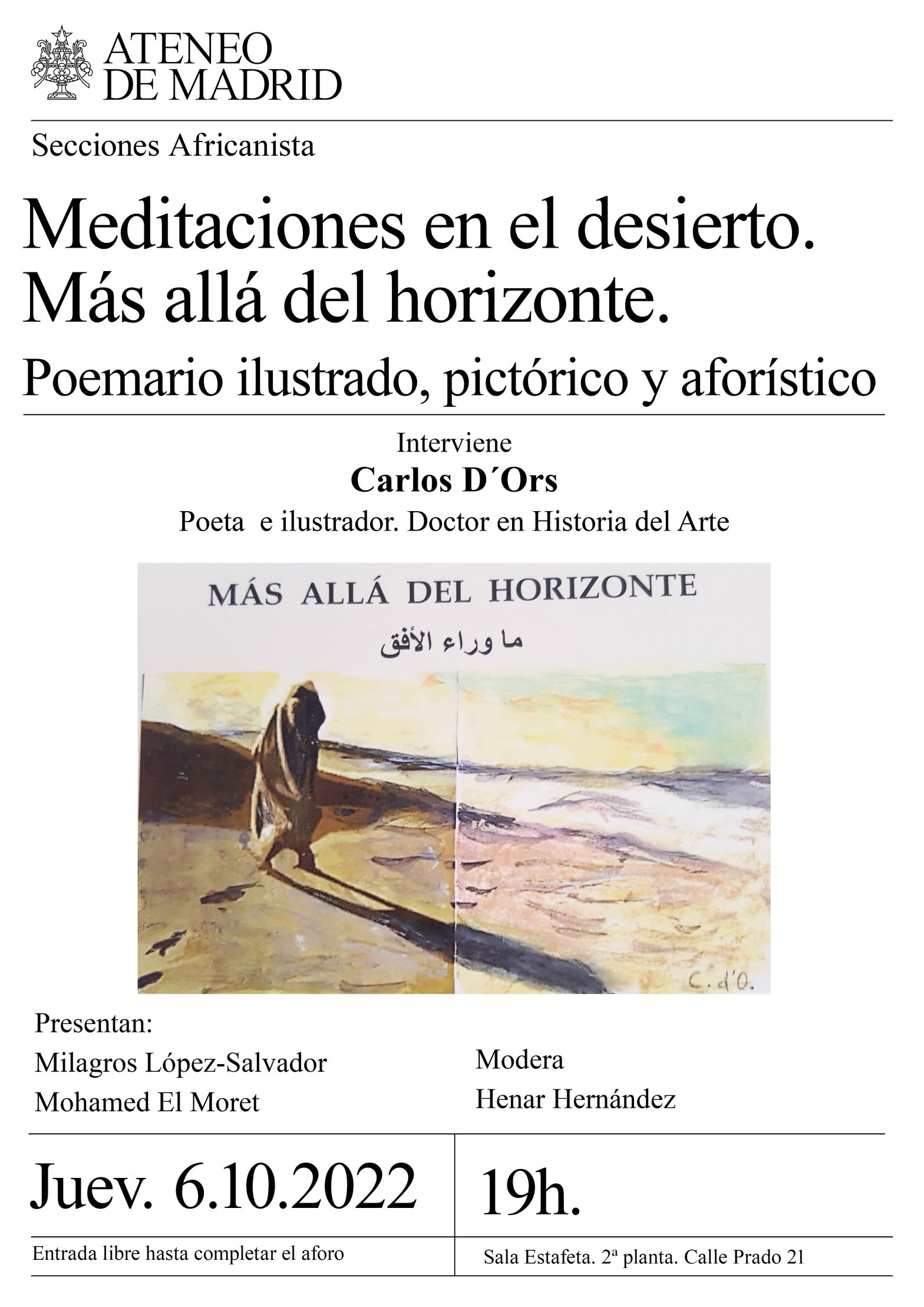 Sección Africanista. Interviene Carlos D´Ors, poeta e ilustrador. Doctor en Historia del Arte. Presentan: Milagros López-Salvador, Mohamed El Moret, escritor árabe. Modera Henar Hernández. Sala Nueva Estafeta. 19 h.