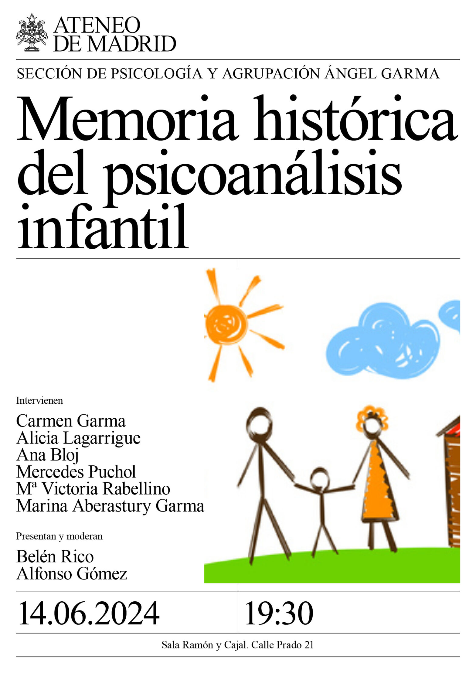 Sección de Psicología y Agrupación Especial Ateneísta Ángel Garma. Intervienen: Carmen Garma, médico y psicoanalista; Alicia Lagarrigue, psicoanalista, presidenta psicosomática de APA; Mercedes Puchol, psicoanalista, presidenta de la APM (Asociación Psicoanalítica de Madrid); Ana Bloj, psicoanalista, profesora de la Universidad de Rosario (Argentina); M.ª Victoria Rabellino, psicoanalista, ganadora del Primer premio Betty Garma; y Marina Aberastury Garma. Presentan y moderan: Belén Rico y Alfonso Gómez. Sala Ramón y Cajal. 19:30h.