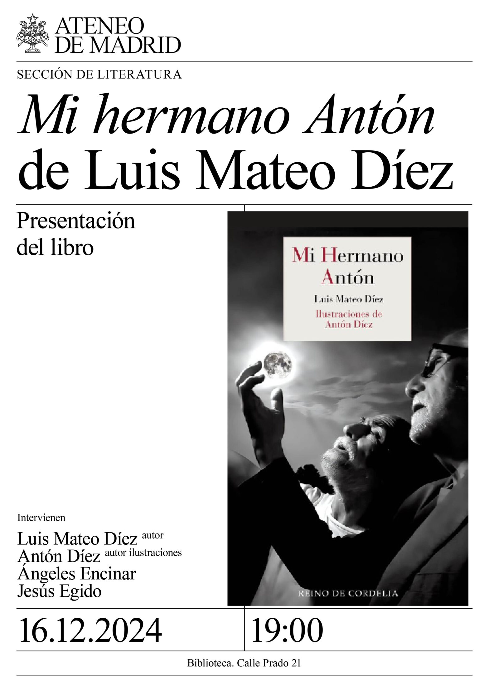 Sección de Literatura. Intervienen: Luis Mateo Díez, autor, premio Cervantes; Antón Díez, autor de las ilustraciones; Ángeles Encinar, catedrática de Literatura, experta en la obra de Luis Mateo Díez; y Jesús Egido, editor Reino de Cordelia. Biblioteca. 19:00h.