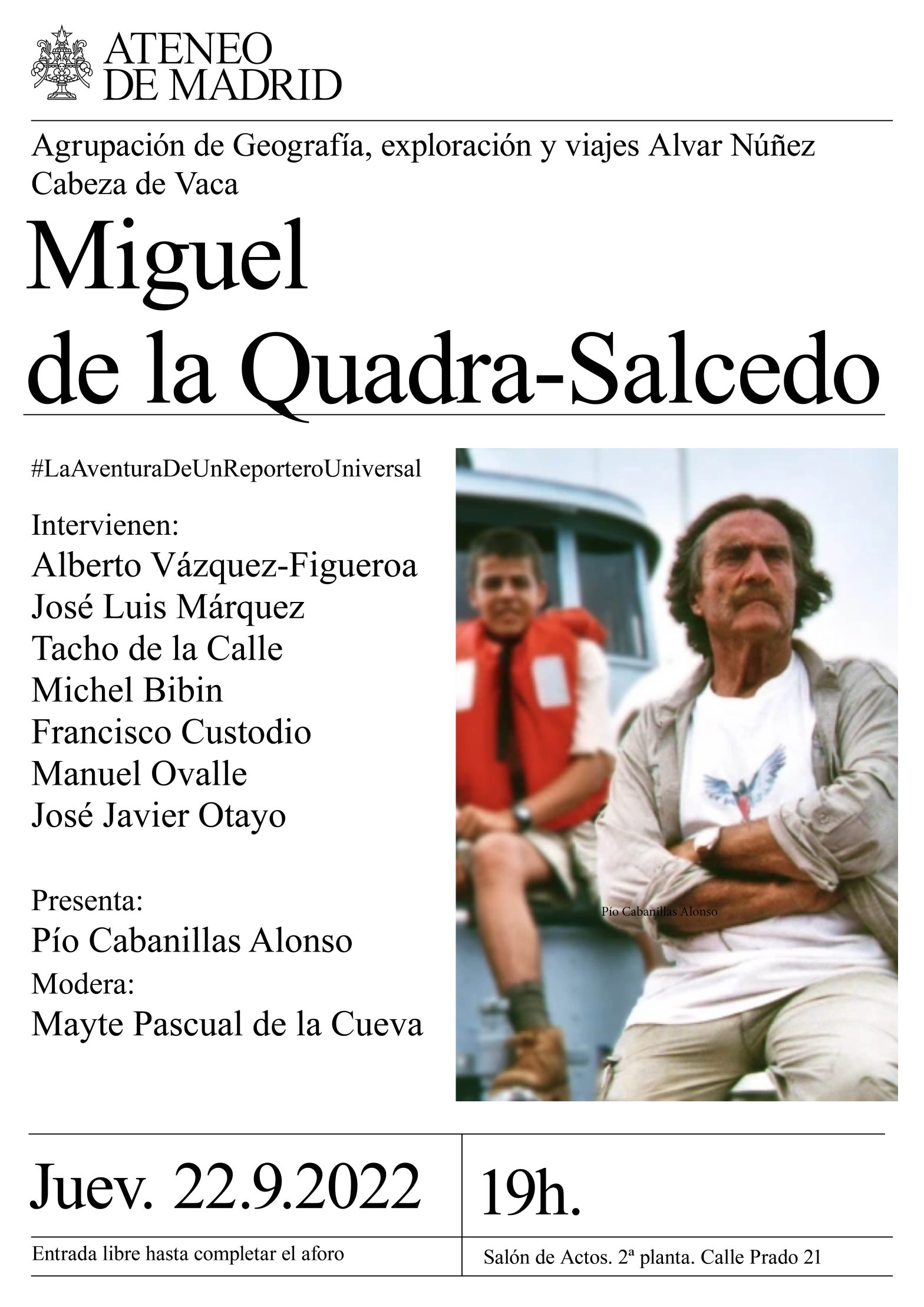 Agrupación Especial de Geografía, Exploración y Viajes Alvar Núñez Cabeza de Vaca. Encuentro Homenaje a Miguel de la Quadra-Salcedo. #LaAventuraDeUnReporteroUniversal. Intervienen: Intervienen: Alberto Vázquez-Figueroa; José Luis Márquez; Tacho de la Calle; Michel Bibin; Francisco Custodio; Manuel Ovalle; José Javier Otayo. Presenta: Pío Cabanillas Alonso. Modera: Mayte Pascual de la Cueva. Nota de prensa (ver)