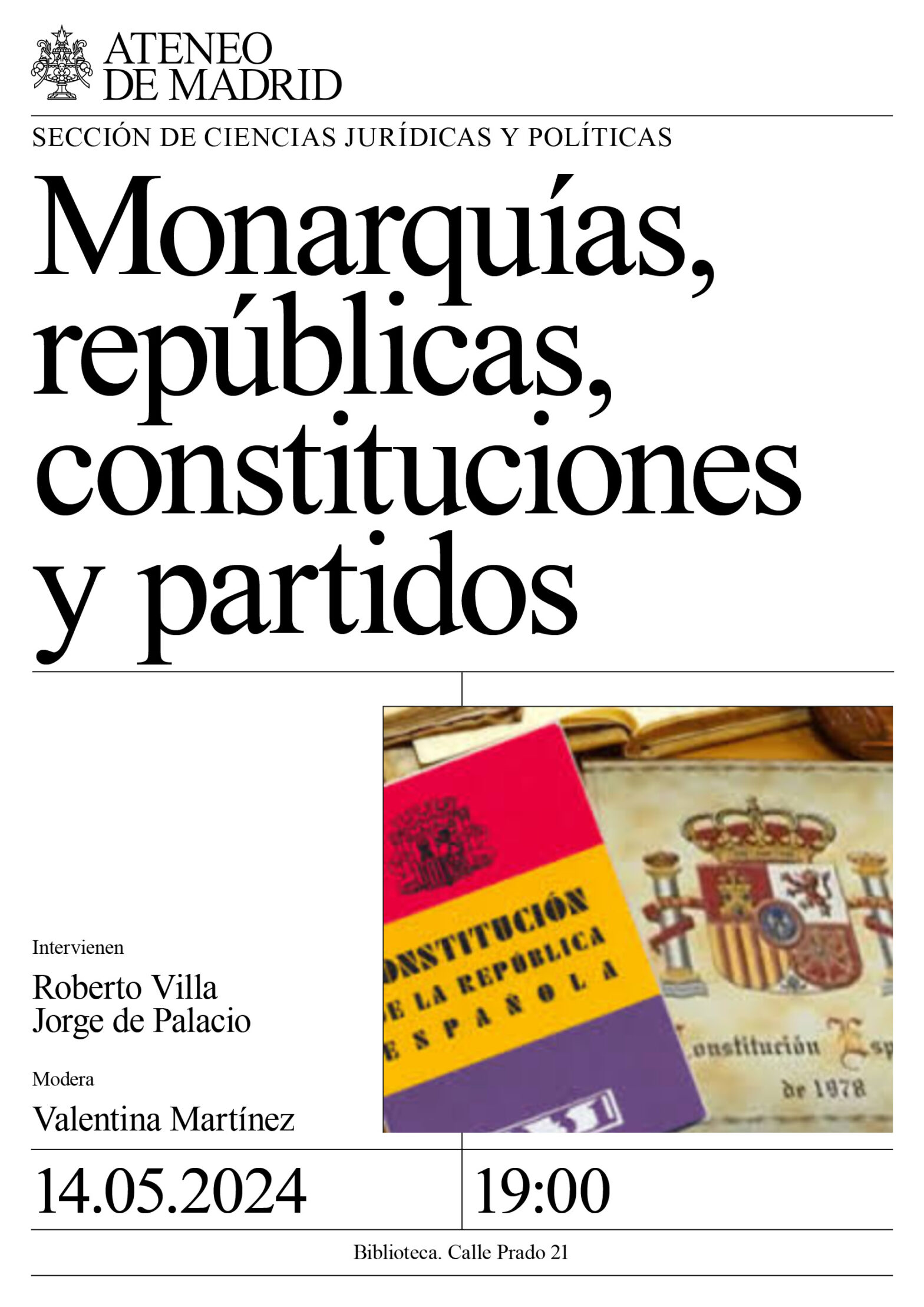 Sección de Ciencias Jurídicas y Políticas. Intervienen: Roberto Villa y Jorge de Palacio, ambos de la Universidad Rey Juan Carlos. Modera: Valentina Martínez. Biblioteca. 19:00h.
