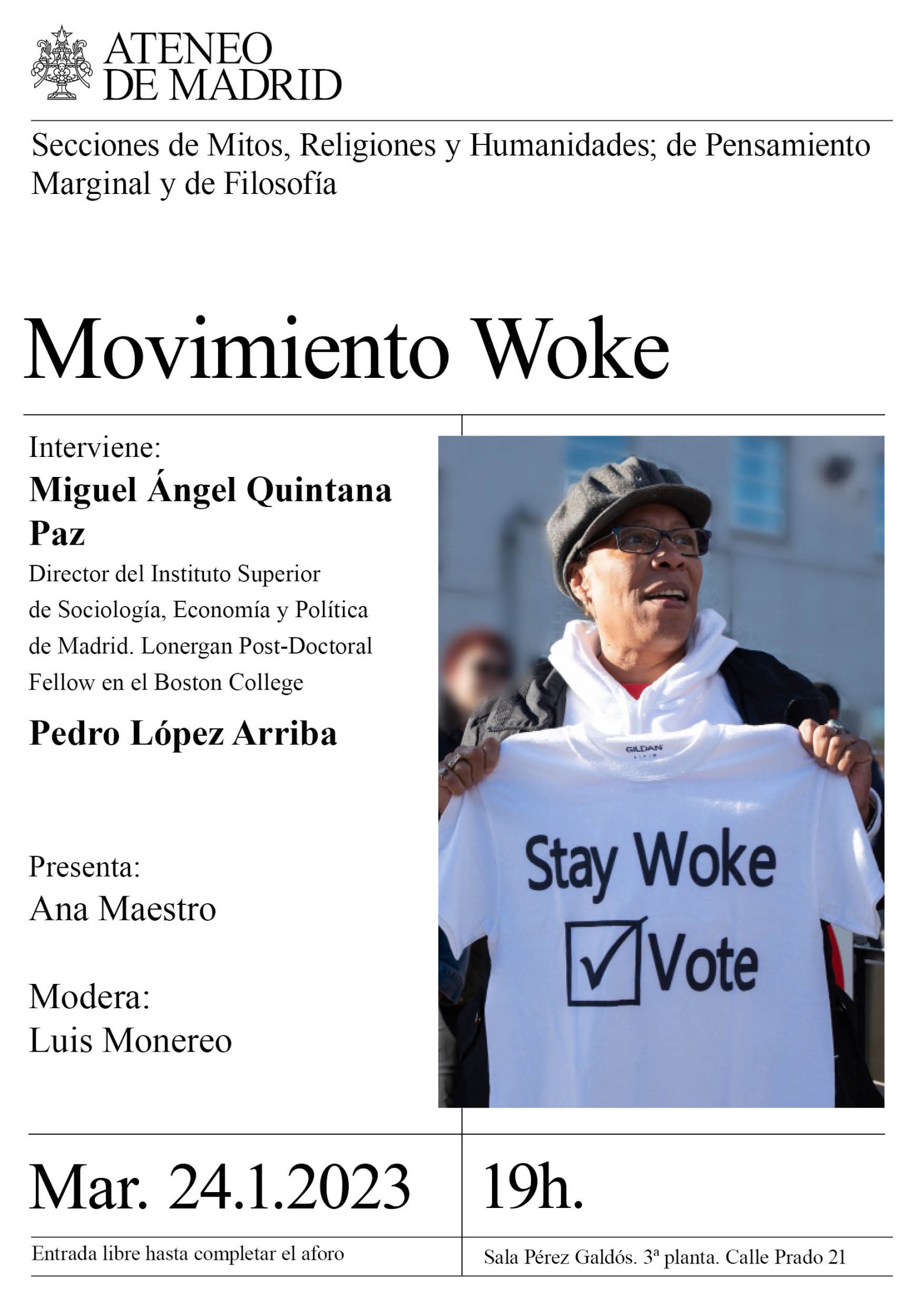 Secciones de Mitos, Religios y Humanidades, de Pensamiento Marginal y de Filosofía. Ponente Miguel Ángel Quintana Paz, director del Instituto Superior de Sociología, Economía y Política de Madrid. Lonergan Post-Doctoral Fellow en el Boston College. Pedro López Arriba. Presenta: Ana Maestro. Modera: Luis Monereo. Sala Pérez Galdós. 19h.