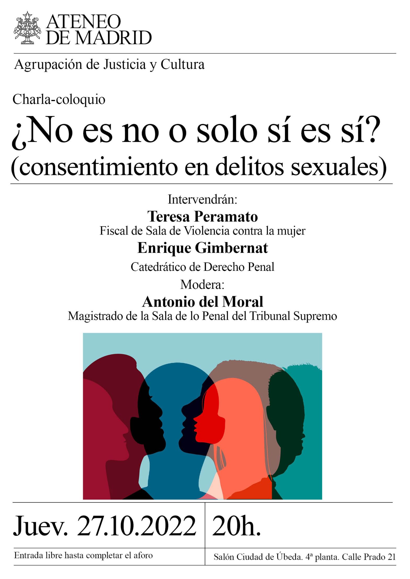 Agrupación de Justicia y Cultura. Intervendrán: Teresa Peramato, fiscal de Sala de Violencia contra la mujer; Enrique Gimbernat, catedrático de Derecho Penal. Modera: Antonio del Moral, magistrado de la Sala de lo Penal del Tribunal Supremo