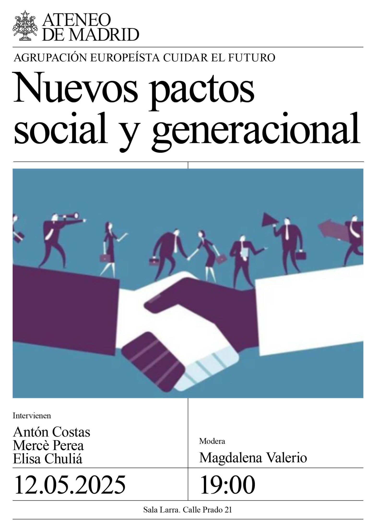 Agrupación Europeísta Cuidar el Futuro. Intervienen: Antón Costas, presidente del Consejo Social; Mercè Perea, presidenta pacto de Toledo; y Elisa Chuliá, profesora de Sociología de la UNED. Modera Magdalena Valerio. Sala Larra. 19:00h.