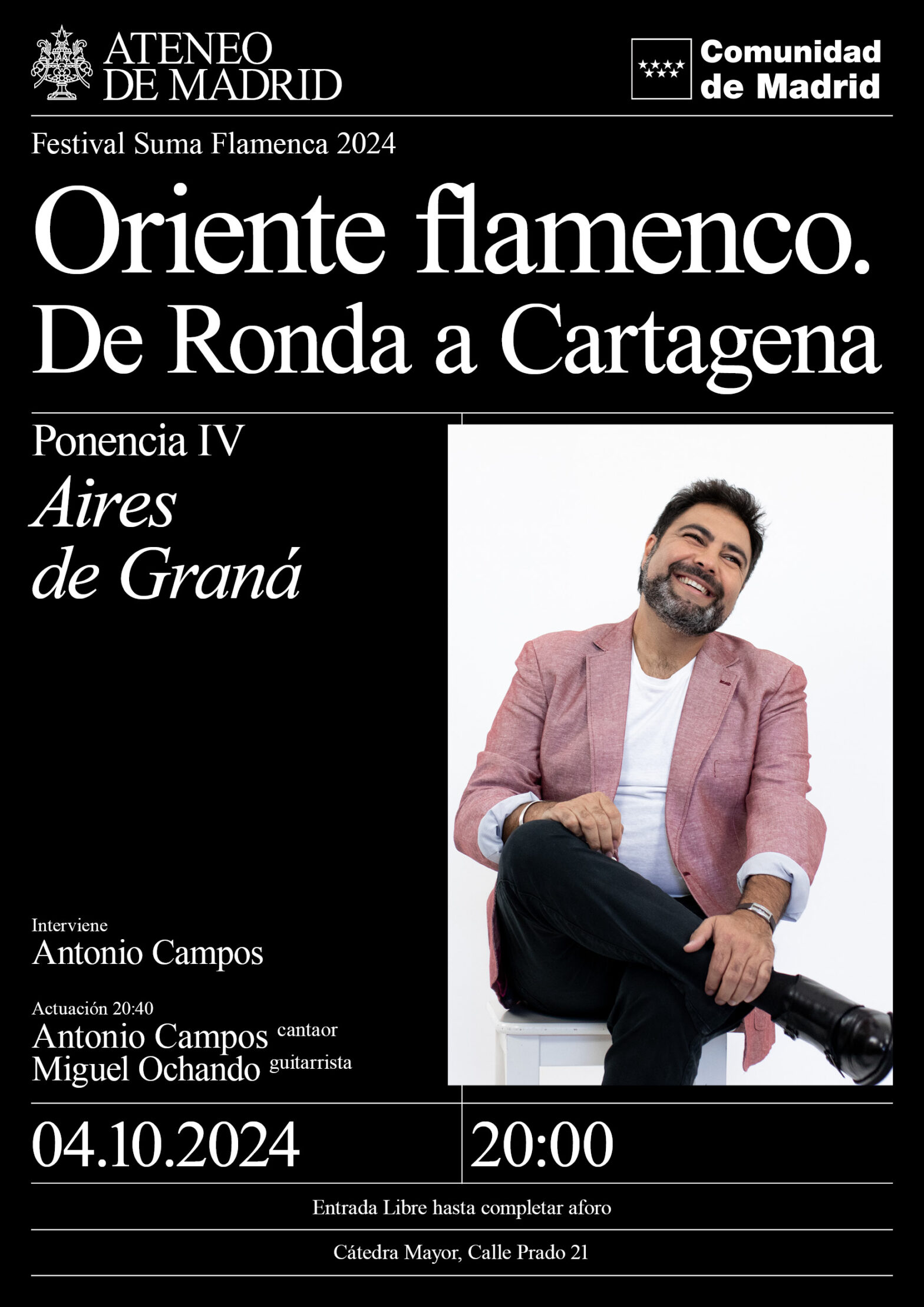 Ponencia IV. Aires de Graná, por Antonio Campos, ponente y cantaor. Actuación Antonio Campos, cantaor de Granada. Miguel Ochando, guitarrista. Cátedra Mayor. 20:00h.