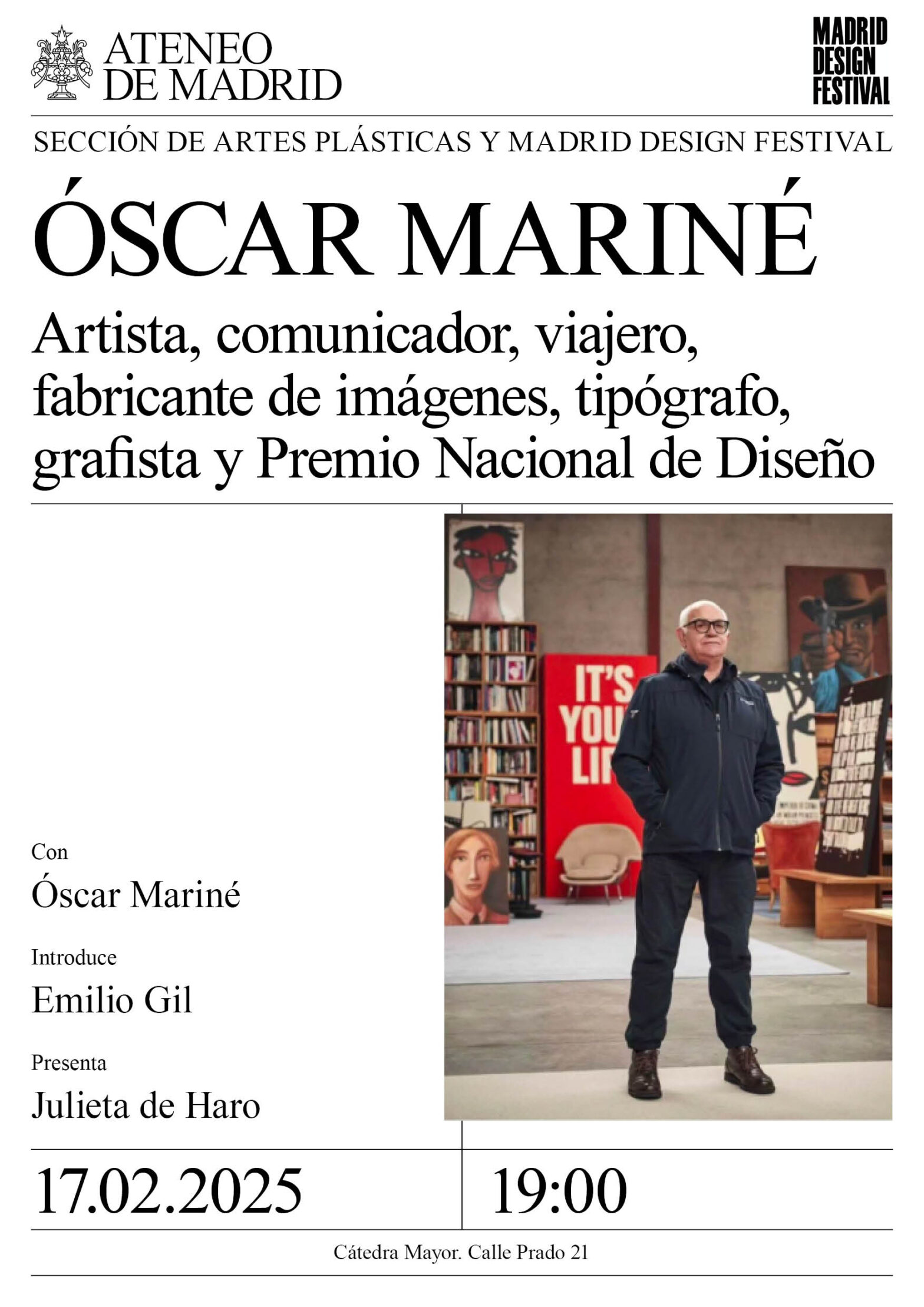 Sección de Artes Plásticas y Madrid Design Festival 25. Con Óscar Mariné. Introduce Emilio Gil, diseñador gráfico. Presenta Julieta de Haro, comisaría de arte y directora artística del Centro Centro. Cátedra Mayor. 19:00h.