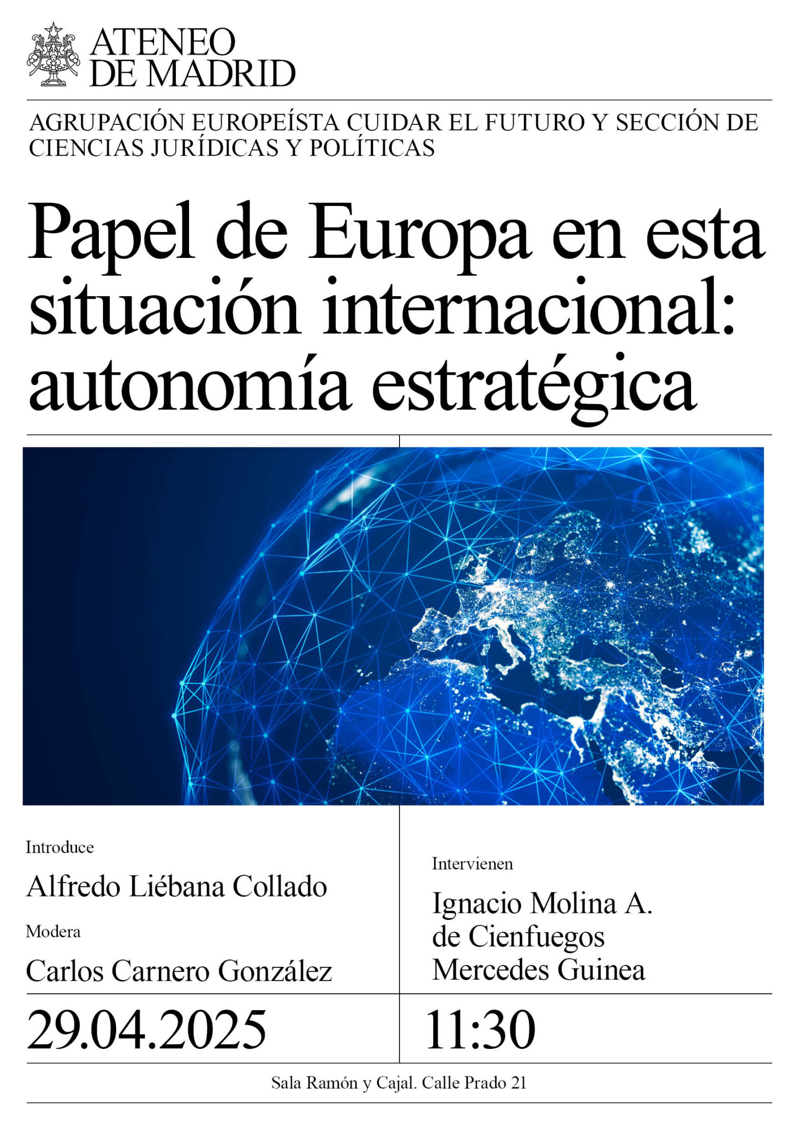 Agrupación Europeísta Cuidar el Futuro y Sección de Ciencias Jurídicas y Políticas. Introduce Alfredo Liébana Collado. Modera Carlos Carnero González, exdiputado europeo. Intervienen: Ignacio Molina A. de Cienfuegos, del Real Instituto Elcano y Mercedes Guinea, profesora de Relaciones Internacionales de la Universidad Complutense. Sala Ramón y Cajal. 11:30h.