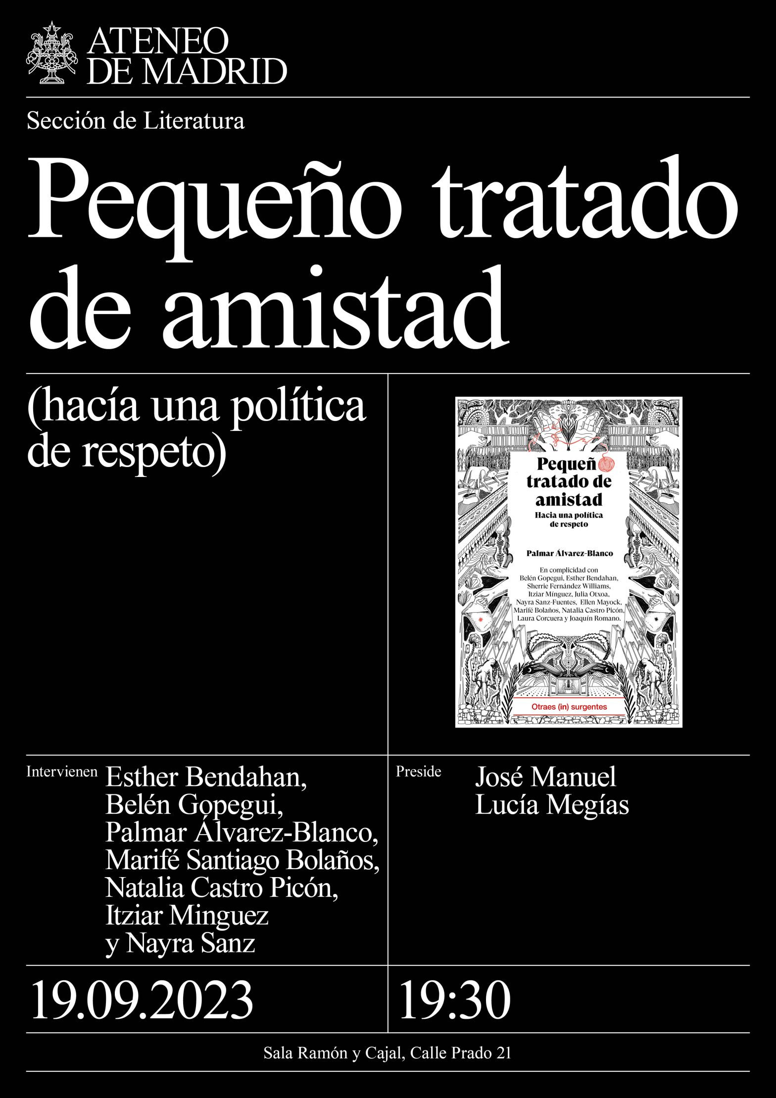 Sección de Literatura. Intervienen: Palmar Álvarez-Blanco, investigadora cultural y autora del volumen; Esther Bendahan, escritora; Natalia Castro Picón, poeta; Belén Gopegui, escritora. Itziar Minguez, poeta; Nayra Sanz, cineasta; Marifé Santiago Bolaños, escritora. Preside: José Manuel Lucía Megías. 19:30h.