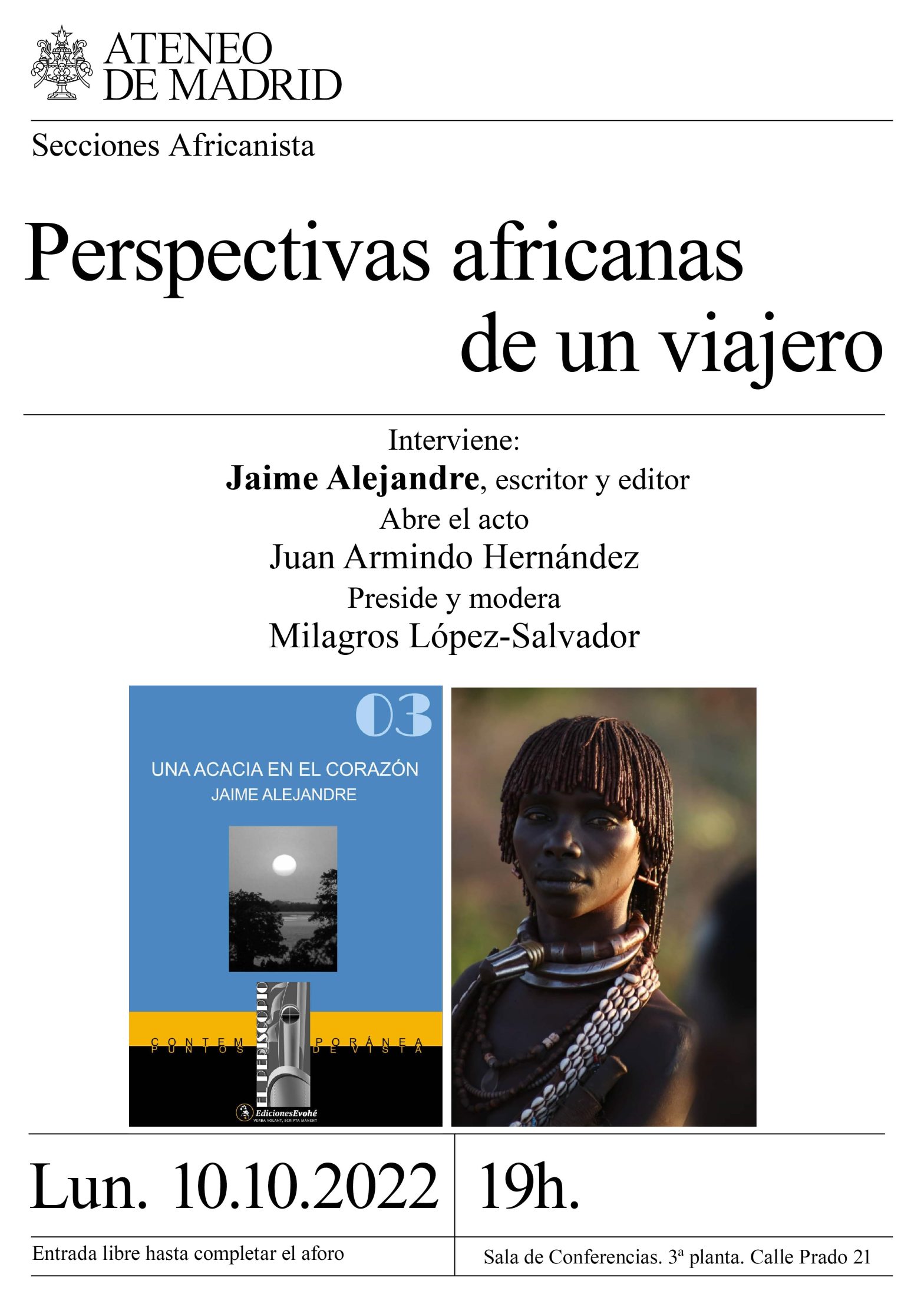 Sección Africanista. Interviene: Jaime Alejandre. Escritor y editor. Abre el acto: Juan Armindo Hernández. Presenta y modera Milagros López-Salvador. Sala de Conferencias. 19 h.