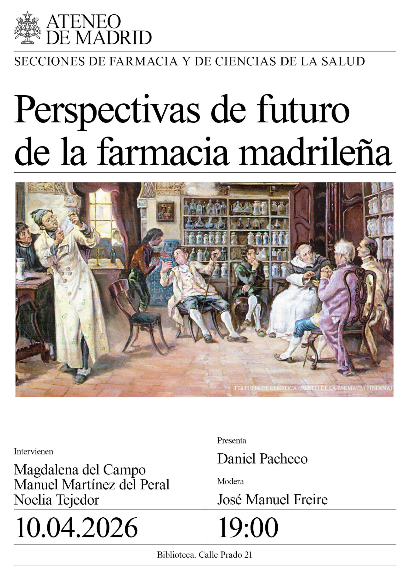 Secciones de Farmacia y de Ciencias de la Salud. Intervienen: Magdalena del Campo, Manuel Martínez del Peral y Noelia Tejedor. Presenta: Daniel Pacheco. Modera José Manuel Freire. Biblioteca. 19:00.