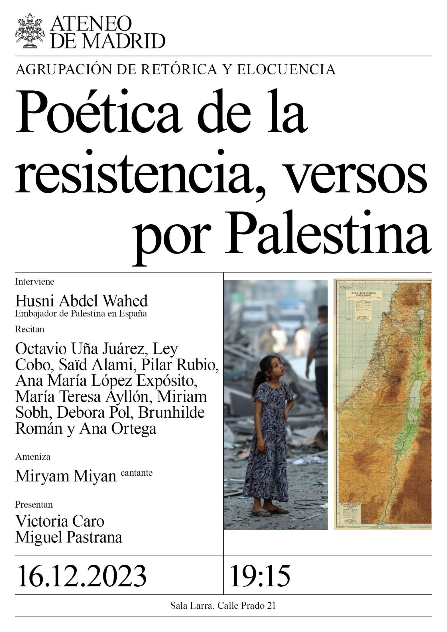 Agrupación de Retórica y Elocuencia. Intervienen: Husni Abdel Wahed, embajador de Palestina en España. Recitan: Octavio Uña Juárez, Ley Cobo, Saïd Alami, Pilar Rubio, Ana María López Expósito, María Teresa Ayllón, Miriam Sobh, Debora Pol, Brunhilde Román y Ana Ortega. Ameniza: Miryam Millán cantante Presentan: María Victoria Caro Bernal y Miguel Pastrana de Almeida. Sala Larra. 19.15h.