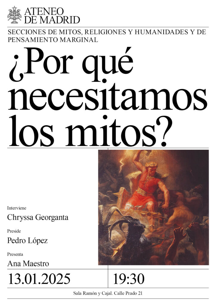 Secciones de Mitos, Religiones y Humanidades y de Pensamiento Marginal. Interviene: Chryssa Georganta. Preside: Pedro López. Presenta: Ana Maestro. Sala Ramón y Cajal. 19:30h.
