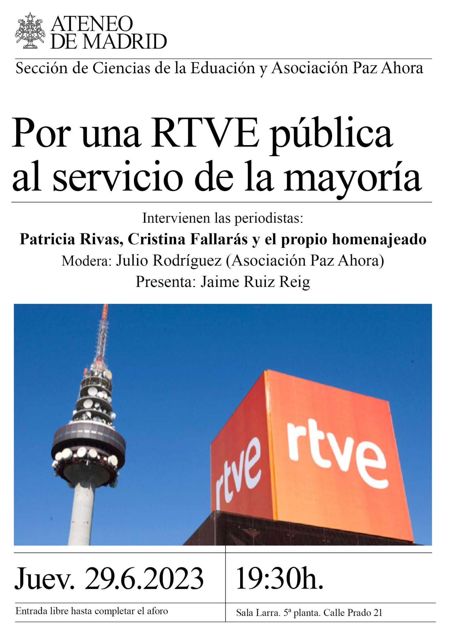 Sección de Ciencias de la Educación. Intervienen las periodistas: Patricia Rivas, Cristina Fallarás y el propio homenajeado. Modera: Julio Rodríguez (Asociación Paz Ahora). Presenta: Jaime Ruiz Reig. Colabora: Asociación Paz Ahora. Sala Larra. 19:30h.