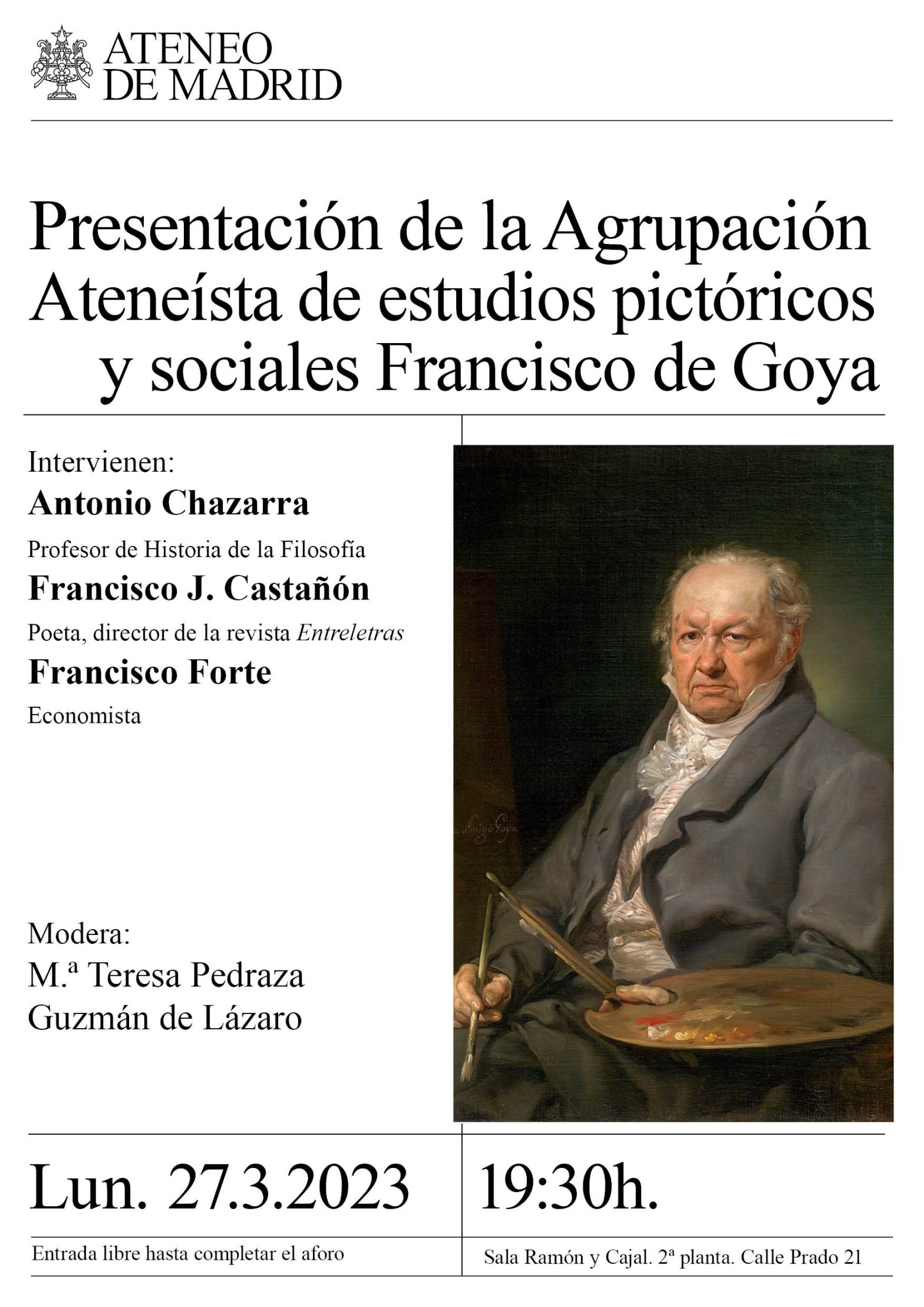 Agrupación Ateneísta de estudios Pictóricos y sociales Francisco de Goya. Intervienen: Antonio Chazarra, profesor de Historia de la Filosofía; Francisco J. Castañón, poeta, director de la revista Entreletras; Francisco Forte, economista. Modera: M.ª Teresa Pedraza