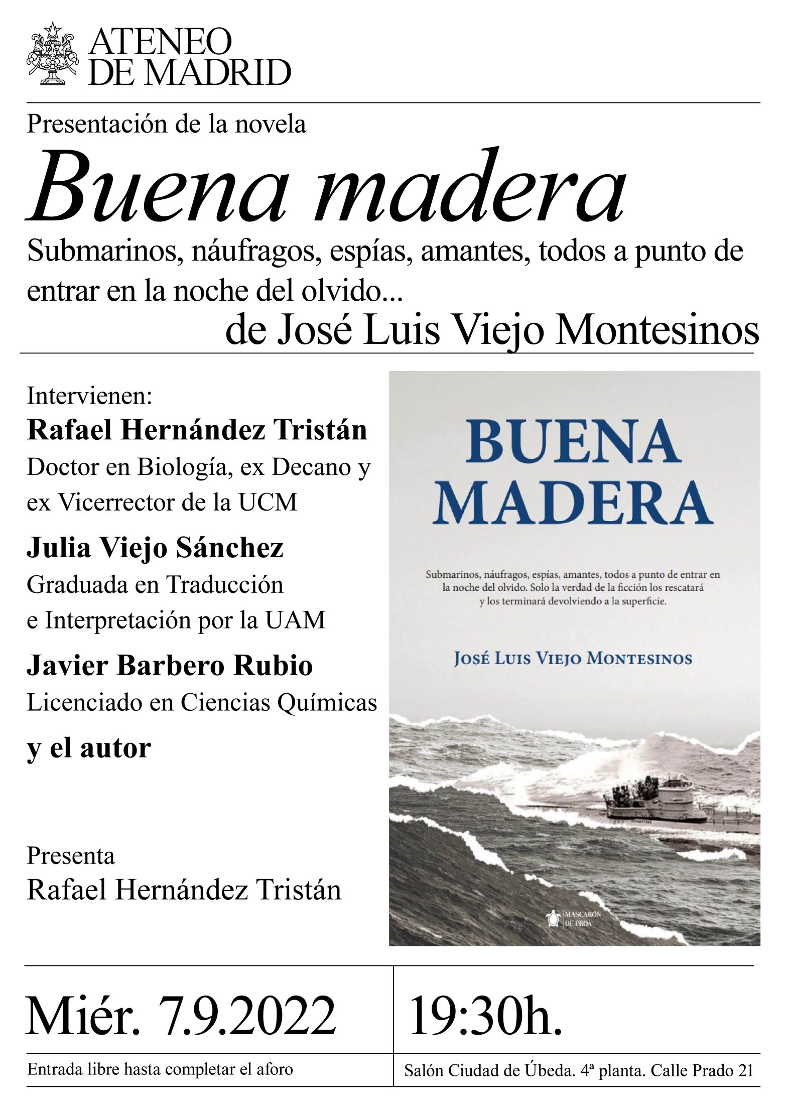 De José Luis Viejo Montesinos. Intervienen: Rafael Hernández Tristán, doctor en Biología, ex decano y ex vicerrector de la UCM. Julia Viejo Sánchez, graduada en Traducción e Interpretación por la UAM; Javier Barbero Rubio, licenciado en Ciencias Químicas y el autor. Presenta Rafael Hernández Tristán. Salón Ciudad de Úbeda. 19.30 h.