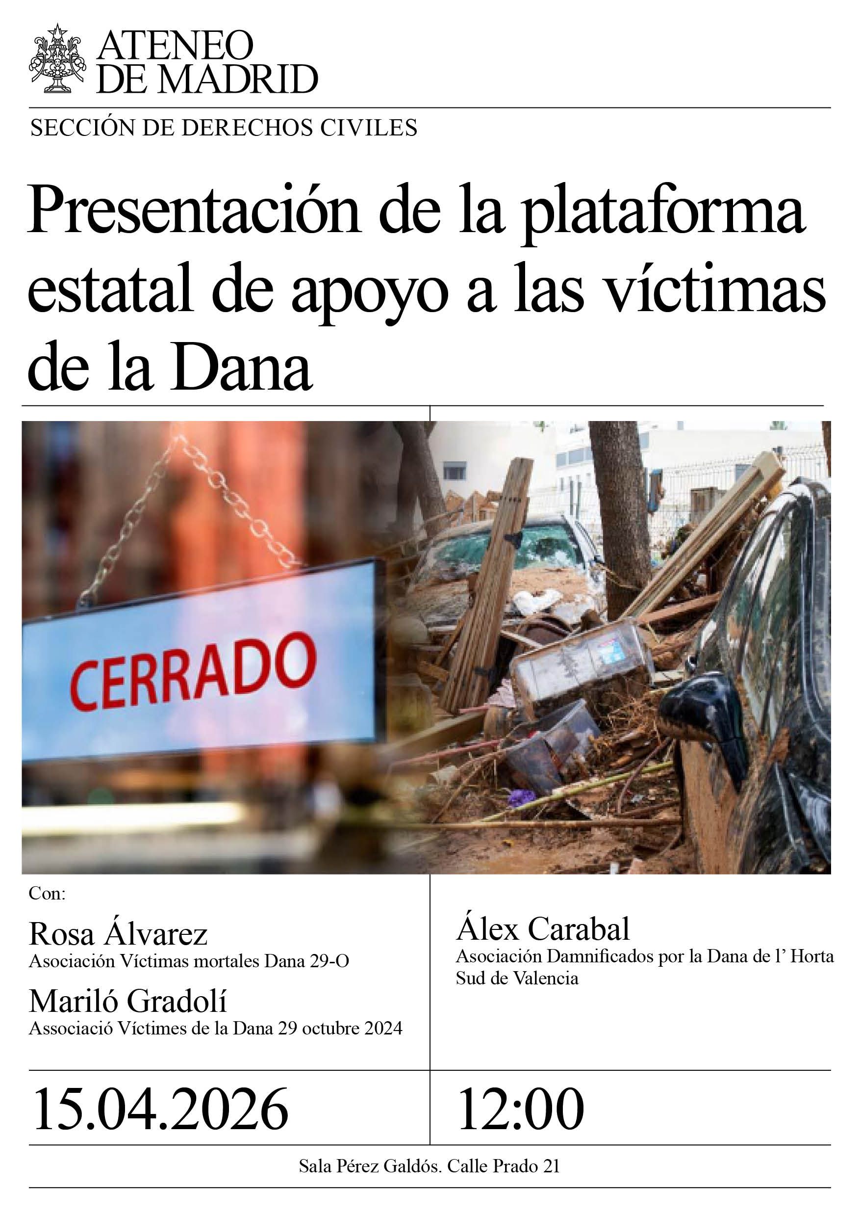 Sección de Derechos Civiles. Con la presencia de organizaciones sociales Rosa Álvarez, Asociación Víctimas mortales Dana 29-O; Mariló Gradolí Associació Víctimes de la Dana 29 octubre 2024; y Álex Carabal, Asociación Damnificados por la Dana de l’ Horta Sud de Valencia. Sala Pérez Galdós. 12:00h.