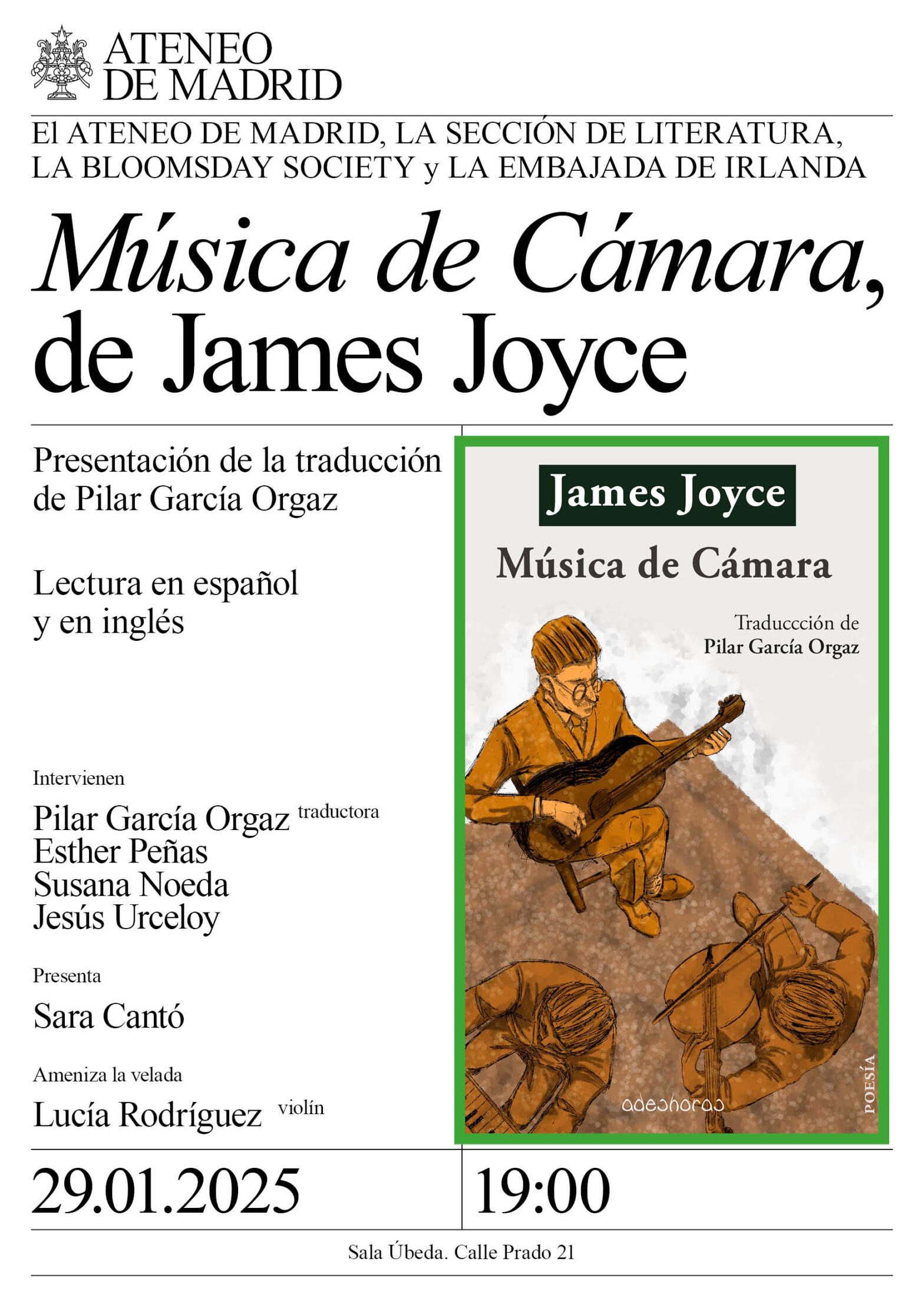 Intervienen: Pilar García Orgaz, traductora; Esther Peñas, poeta; y Susana Noeda y Jesús Urceloy, Editorial Adeshoras. Presenta: Sara Cantó. Ameniza la velada: Lucía Rodríguez, violín. Salón Ciudad de Úbeda.