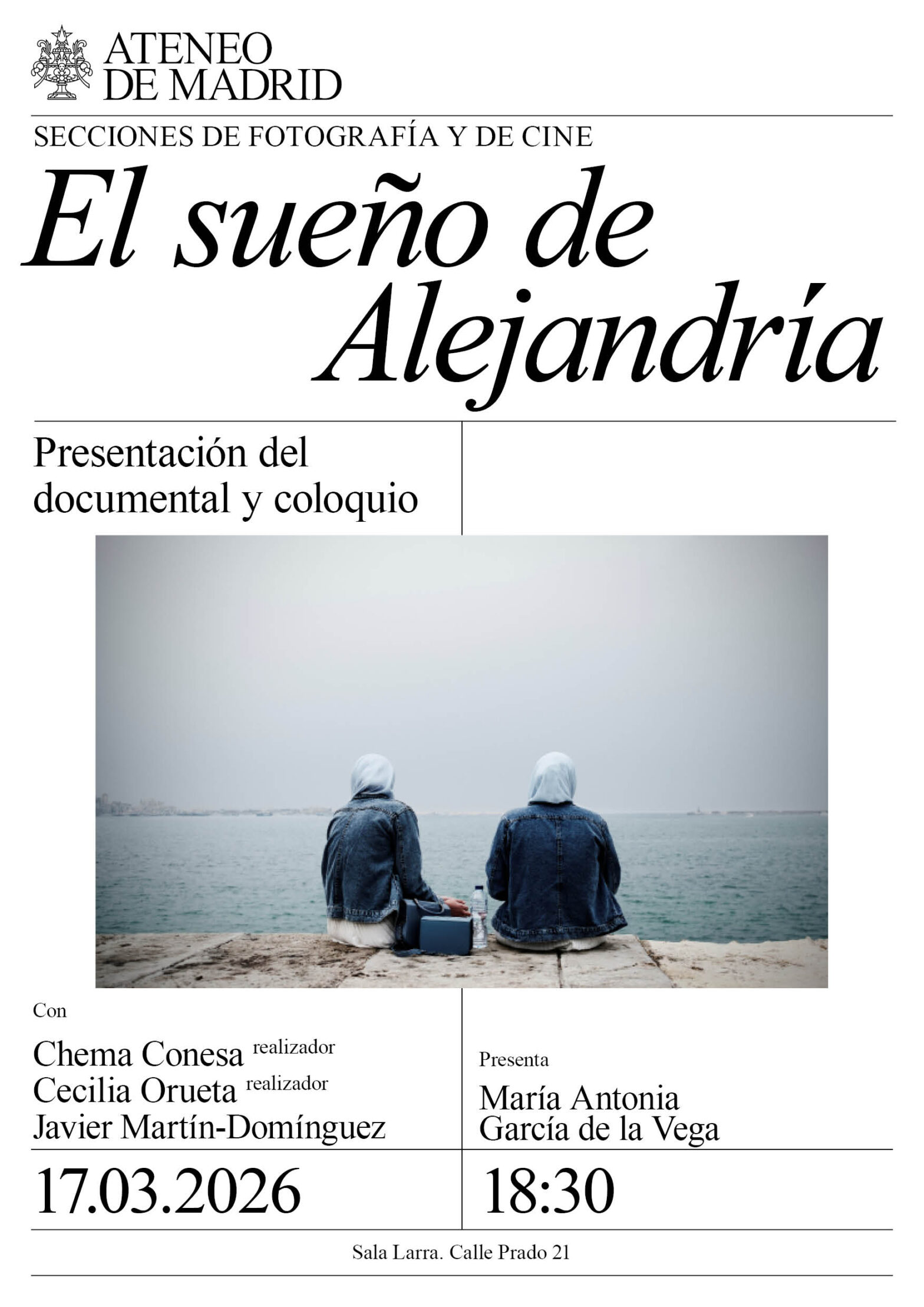 Secciones de Fotografía y de Cine. Con: Chema Conesa, realizador del documental y fotógrafo; Cecilia Orueta Carvallo, realizadora del documental y fotógrafa; y Javier Martín Domínguez. Presenta: María Antonia García de la Vega. Sala Larra. 18:30h.
