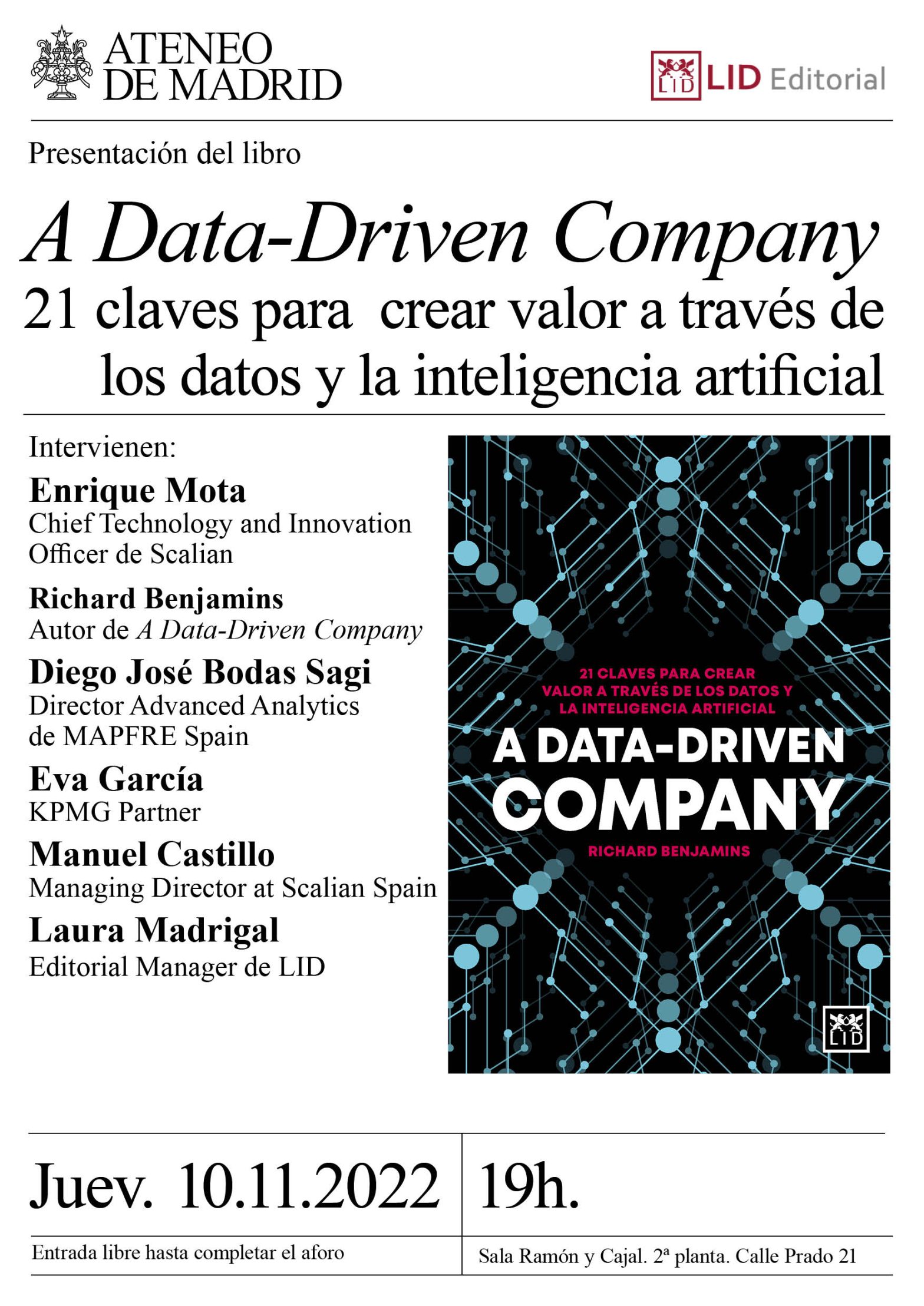 Intervienen: Enrique Mota, Chief Technology and Innovation Officer de Scalian, Richard Benjamins, autor de A Data-Driven Company, Diego José Bodas Sagi, Director Advanced Analytics de MAPFRE Spain,Eva García, KPMG Partner,Manuel Castillo, Managing Director at Scalian Spain y Laura Madrigal, Editorial Manager de LID.Sala Ramón y Cajal. 19 h. Nota.