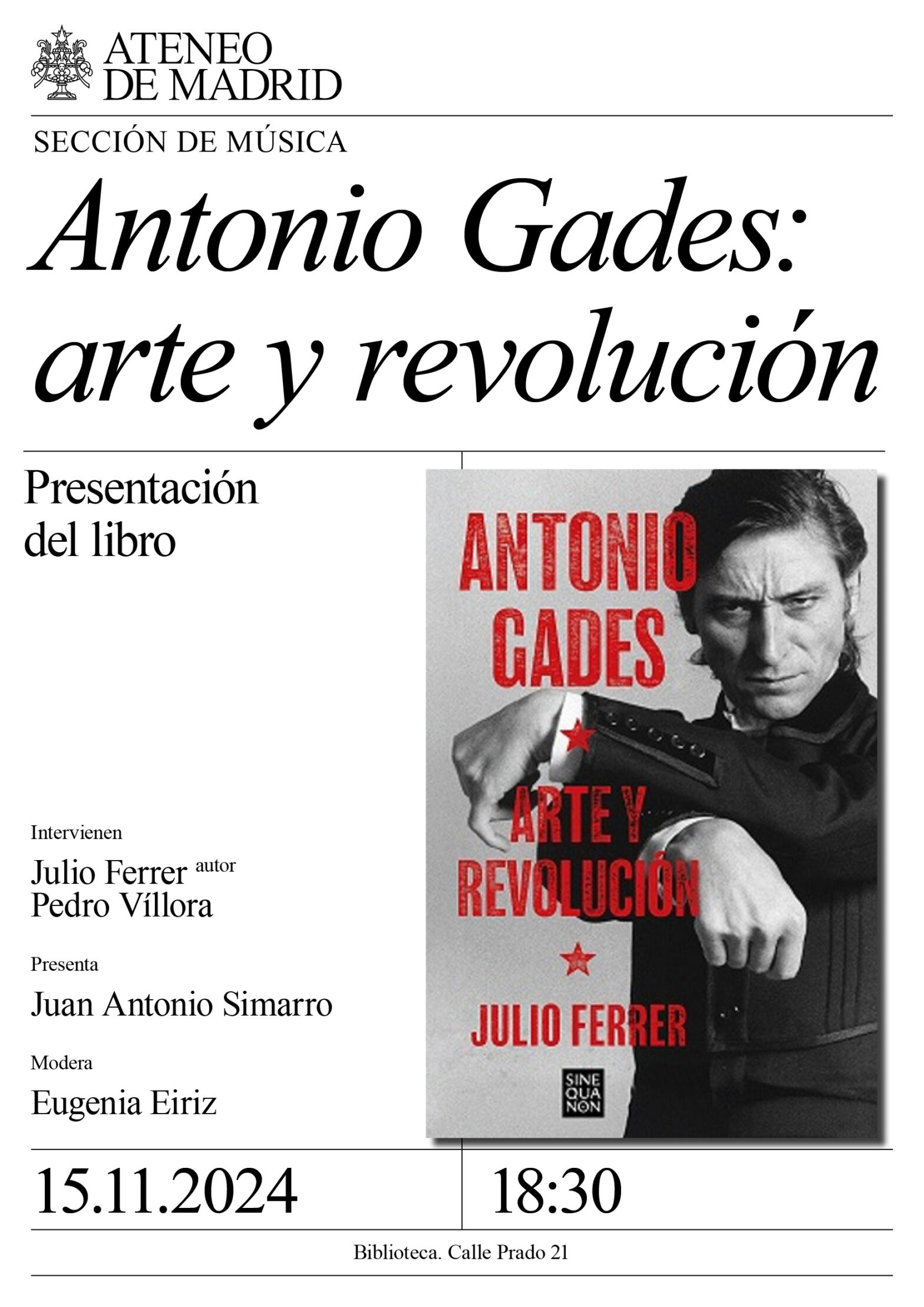 Sección de Música. Intervienen: Julio Ferrer, autor del libro; Julio Ferrer, periodista, escritor y docente y Pedro Víllora, dramaturgo, periodista y profesor de Teoría e Historia del Teatro en la RESAD.  Presenta: Juan Antonio Simarro, compositor. Modera: Eugenia Eiriz, directora general de la FAG y viuda de Antonio Gades. Biblioteca. 18:30h.
