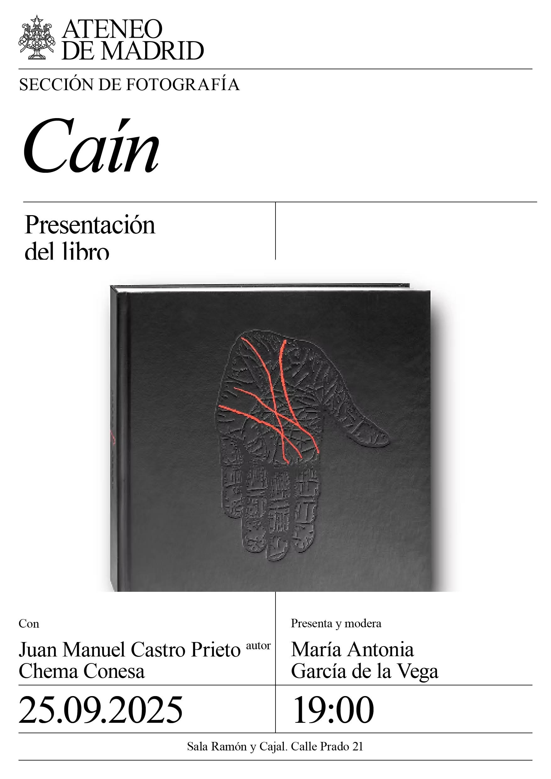 Sección de Fotografía. Con: Juan Manuel Castro Prieto, autor y Chema Conesa. Presenta y modera: María Antonia García de la Vega. Sala Ramón y Cajal. 19:00h.