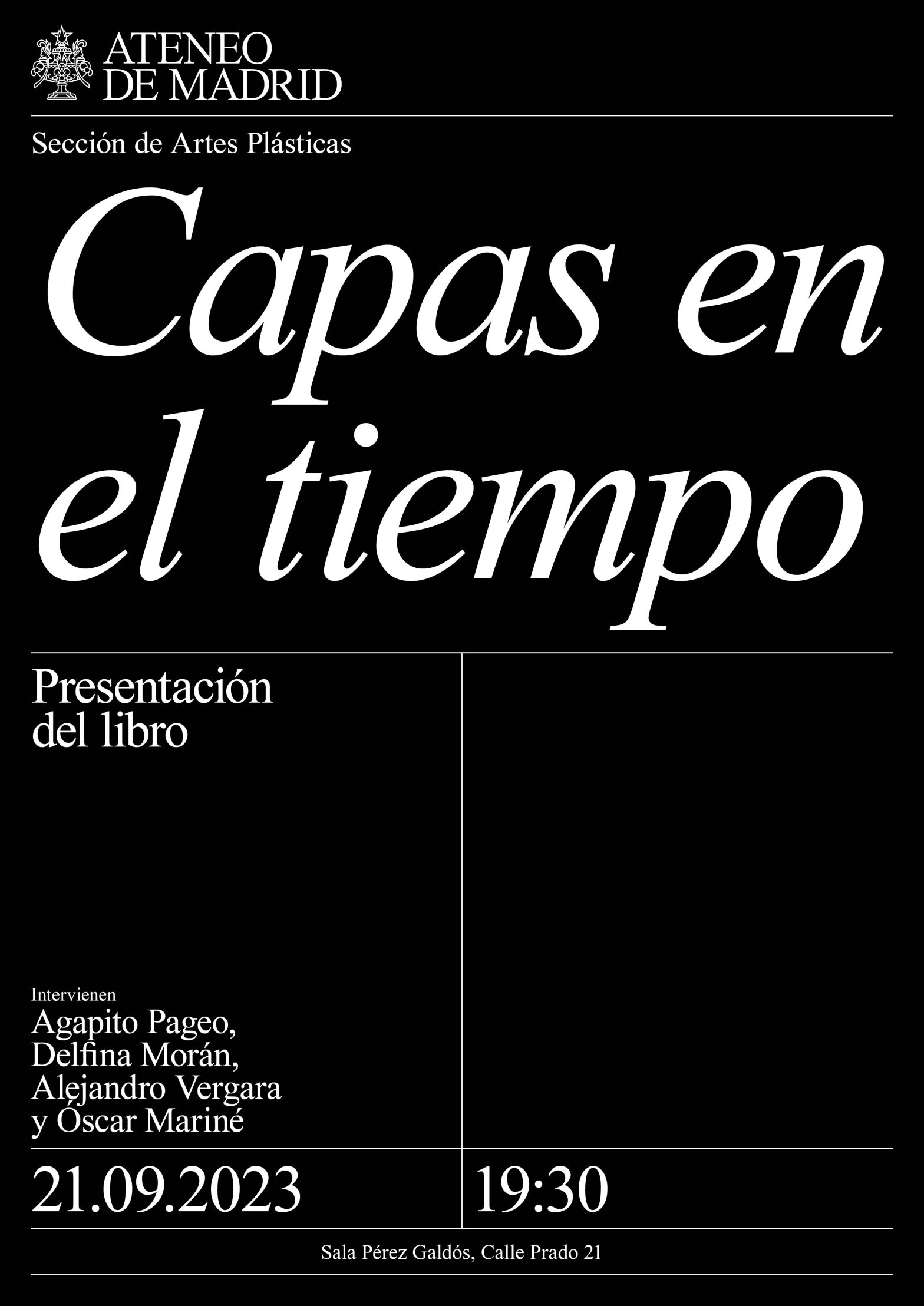 Sección de Artes Plásticas. Intervienen: Agapito Pageo, Junta de Gobierno del Ateneo; Delfina Morán, directora del Máster en UX de UDIT y Telefónica; Alejandro Vergara, conservador jefe de Pintura Flamenca y Escuelas del Norte del Museo del Prado; Óscar Mariné, premio Nacional de Diseño y presidente de la Sección de Artes Plásticas del Ateneo. Sala Pérez Galdós. 19:30h.